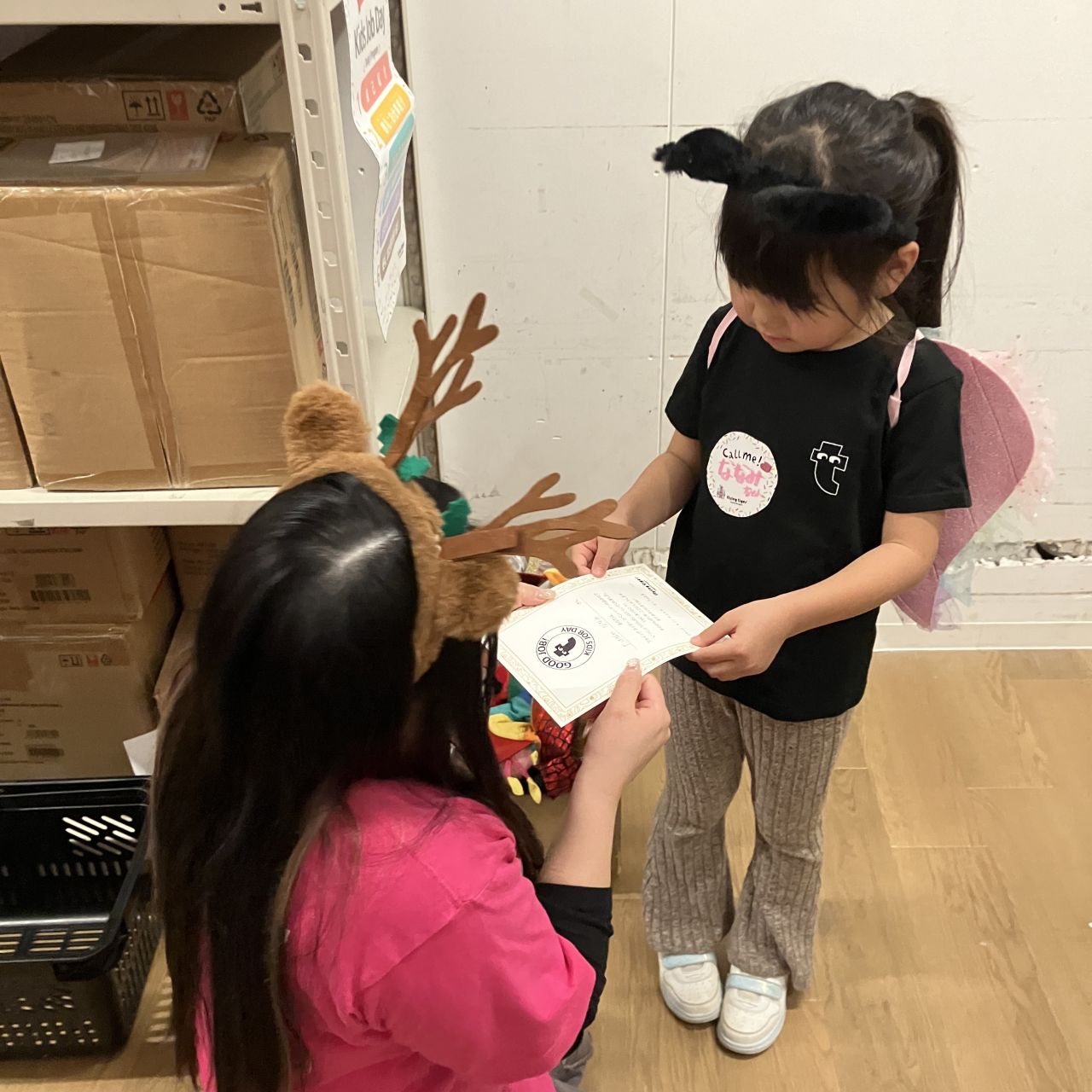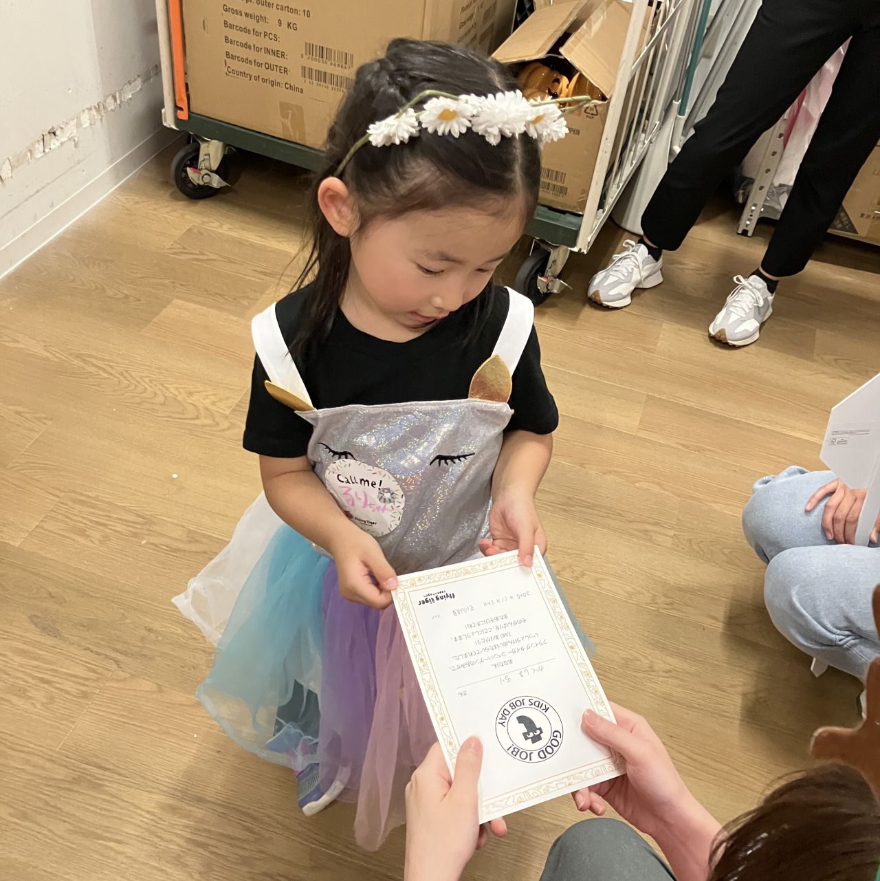 最後に、賞状とお給料(お買い物チケット)をお渡しして