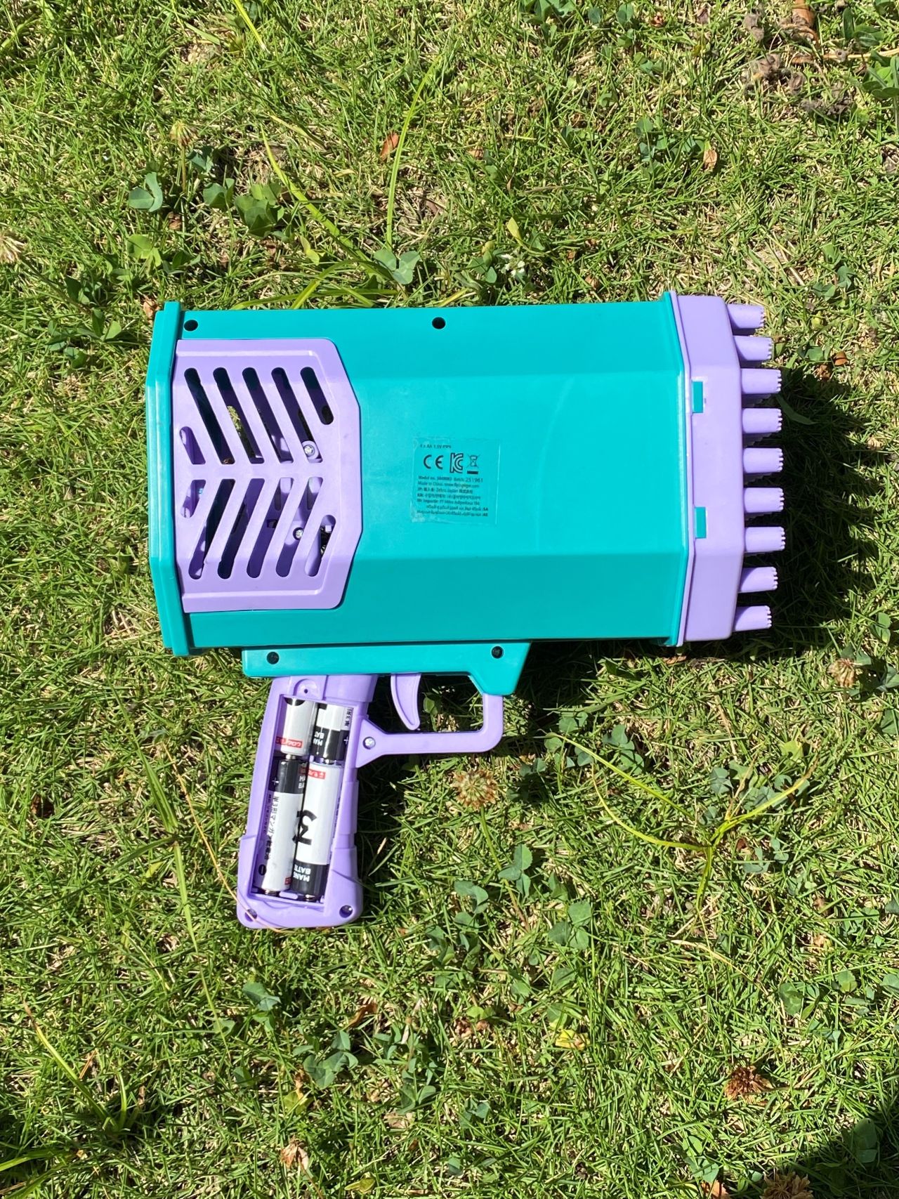 ① シャボン玉バズーカ本体に単3形電池 4本いれます(電池は別売りです)