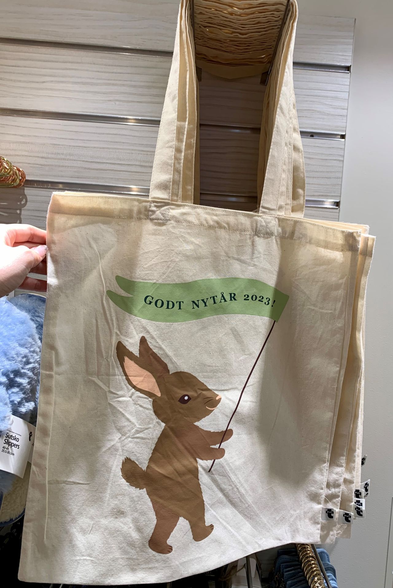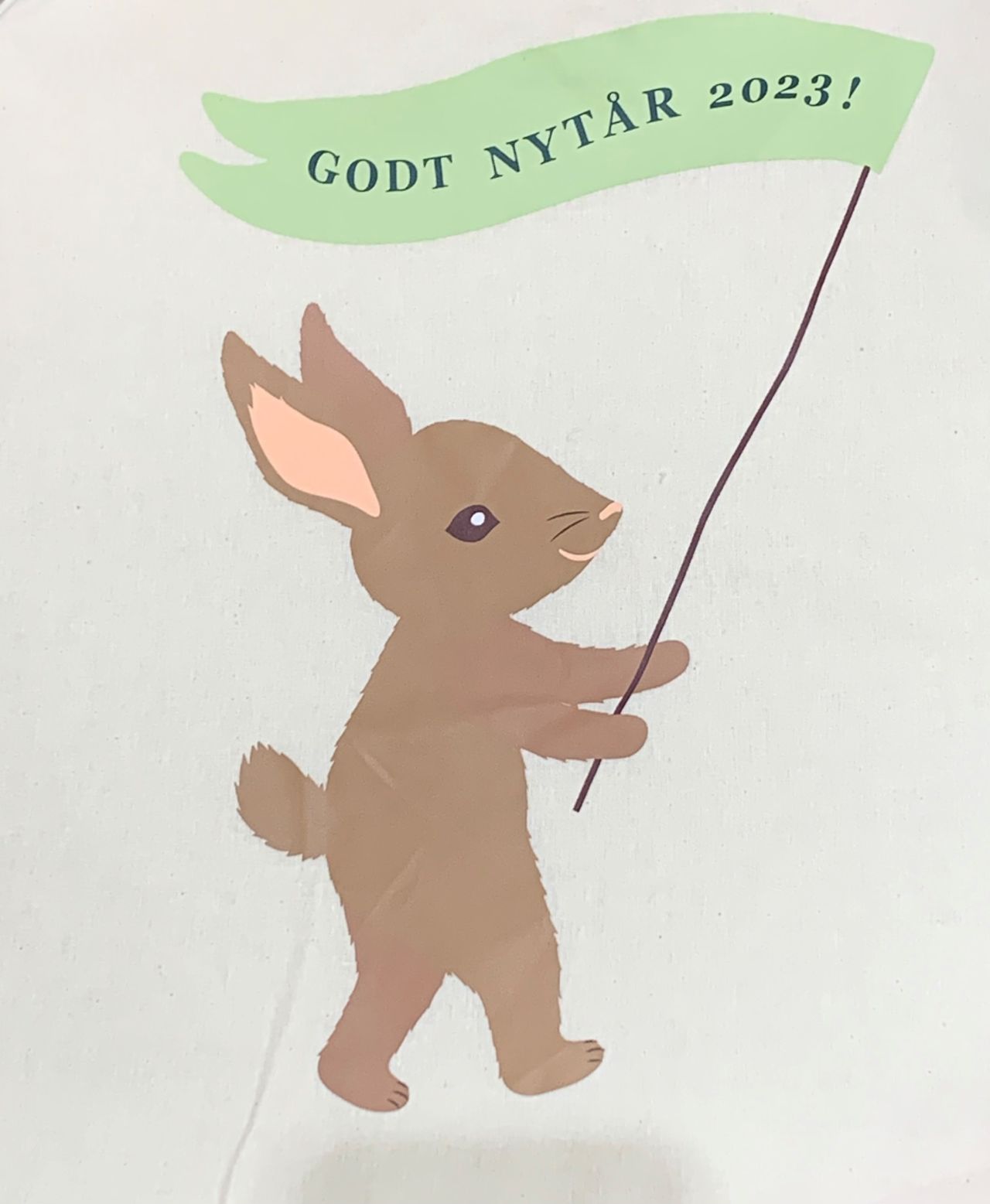 なんと言ってもウサギの優しいスマイルが魅力的(^▽^)/ ニューイヤートートとはいえ派手過ぎず、日常使いもしやすいデザインかと思います。ワッペンや缶バッジをつけてアレンジするのもGood◎ ウサギが持っている旗には、「GODT NYTÅR」という言葉が…!「あけましておめでとう」を意味するデンマーク語です(⌒∇⌒)