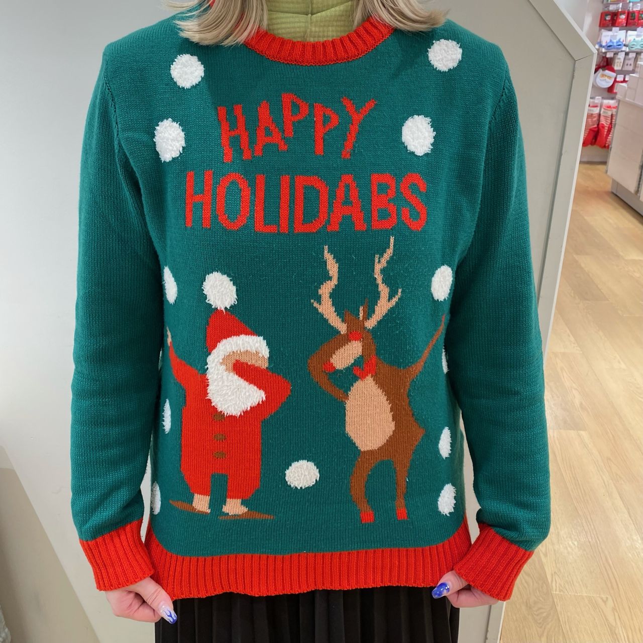 緑色のニットはサンタさんとトナカイが楽しそうなポーズをしたユニークなデザイン