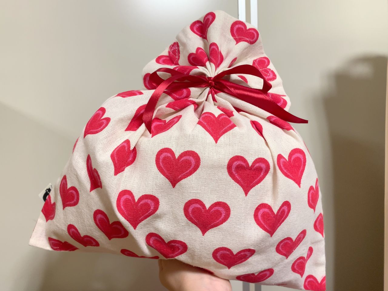 可愛らしいピンクが特徴です。右側のショッピングバッグはマチありで生地も厚手のタイプ。プレゼントをたくさん入れても大丈夫ですよー!