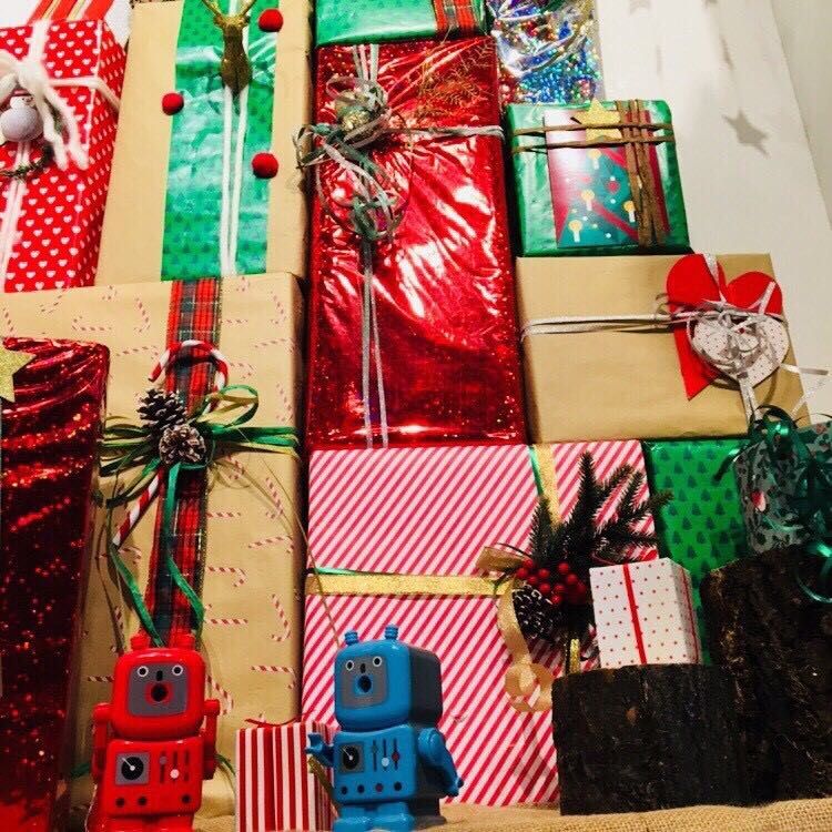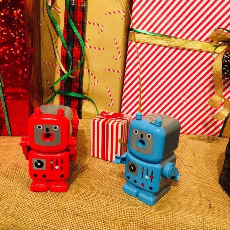 ロボット君たちも、包んだプレゼントをツリーに飾り付けました。