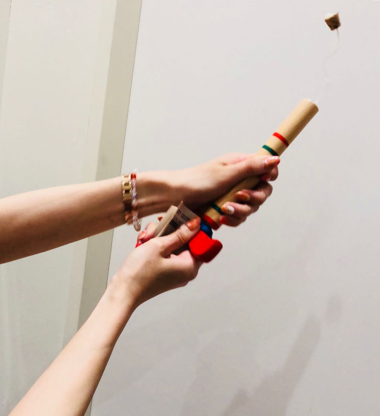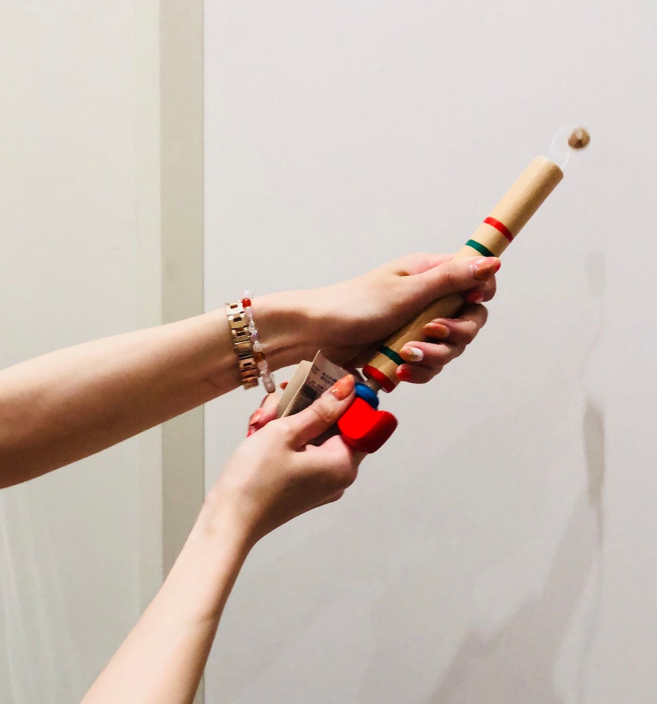 こちらの商品は、レバーを引いていただいて、思いっきり押すと、コルクが出てきて“ポンッ”と良い音が鳴るおもちゃです。