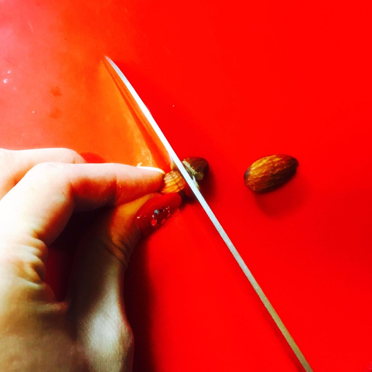 ①アーモンド1粒は丸々残しておいて、あとはみじん切りにし、フライパンで煎ります。