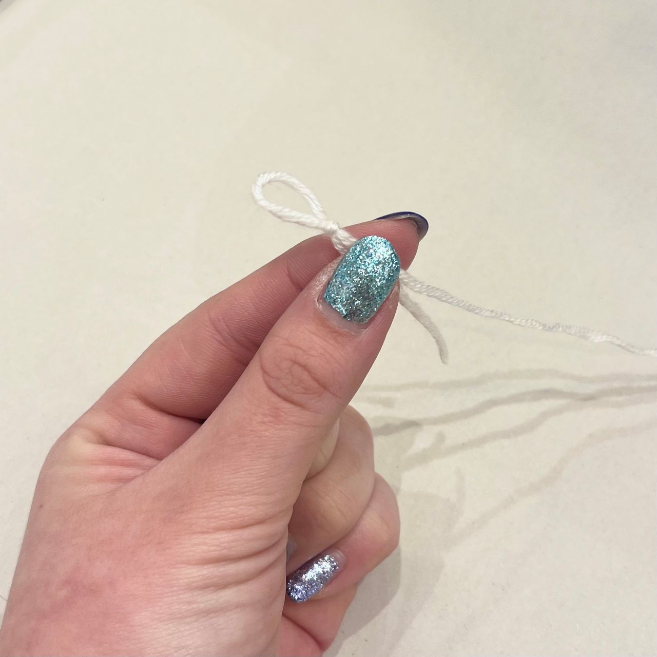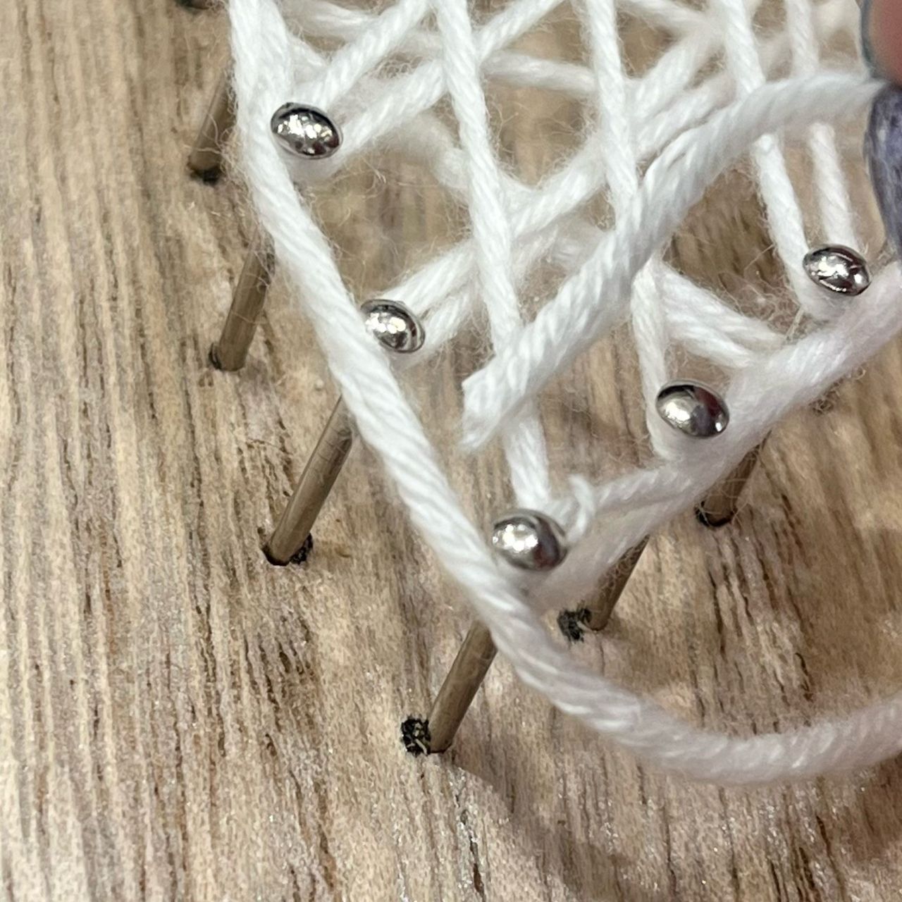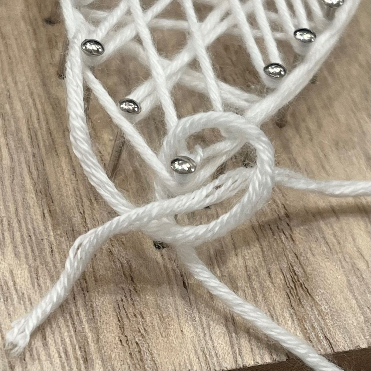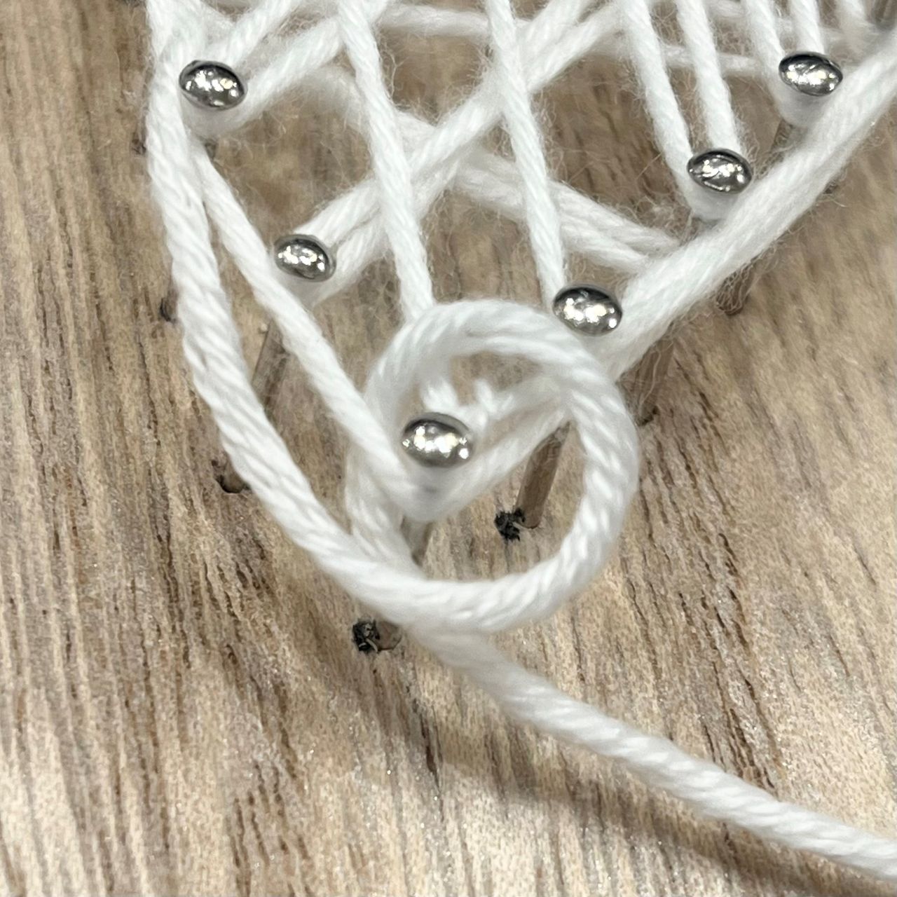 ②最初の釘に引っかける輪っかを作り、余分の糸を切ります。