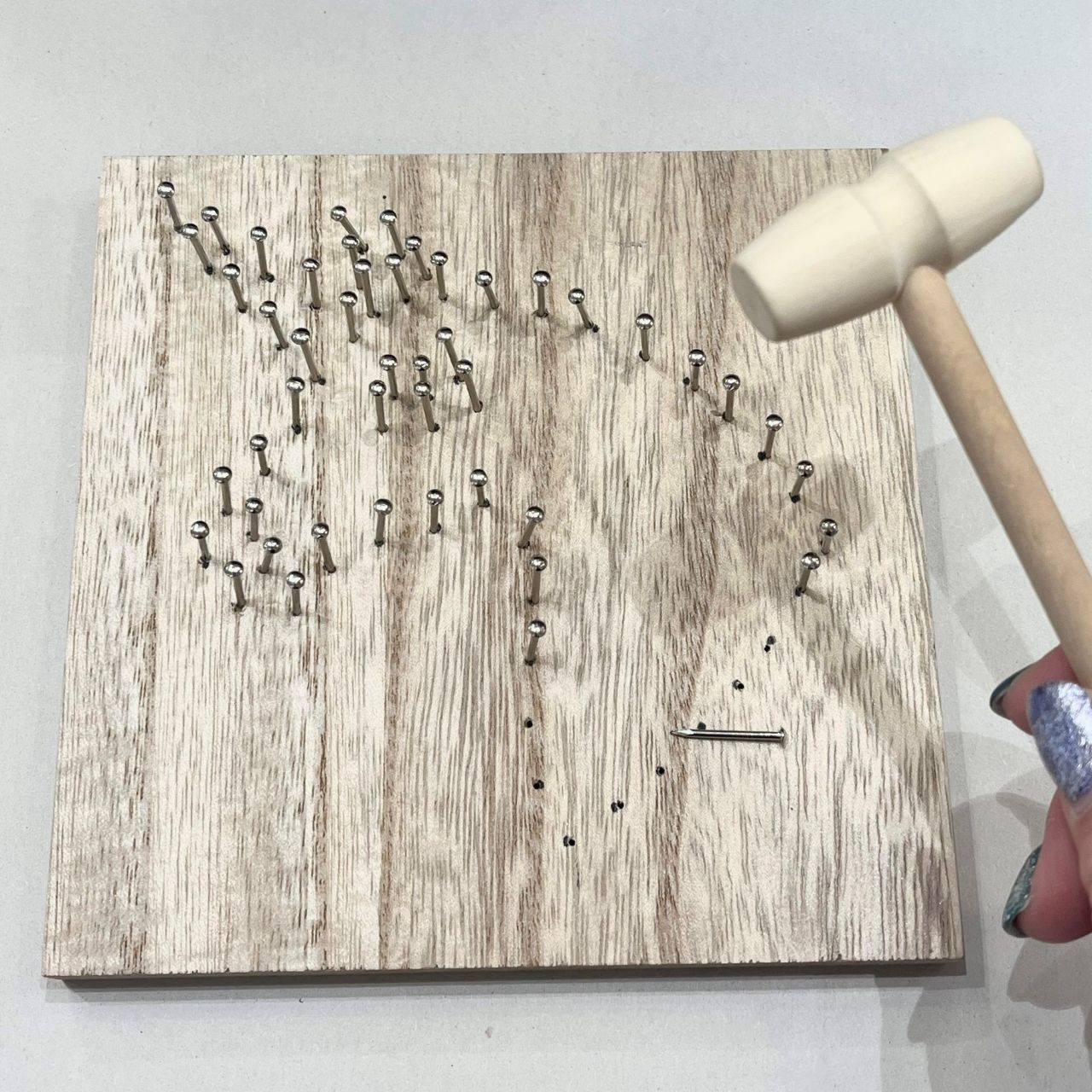 ①板にあらかじめユニコーン柄の点線が書かれているので、その上に釘を打ちます。