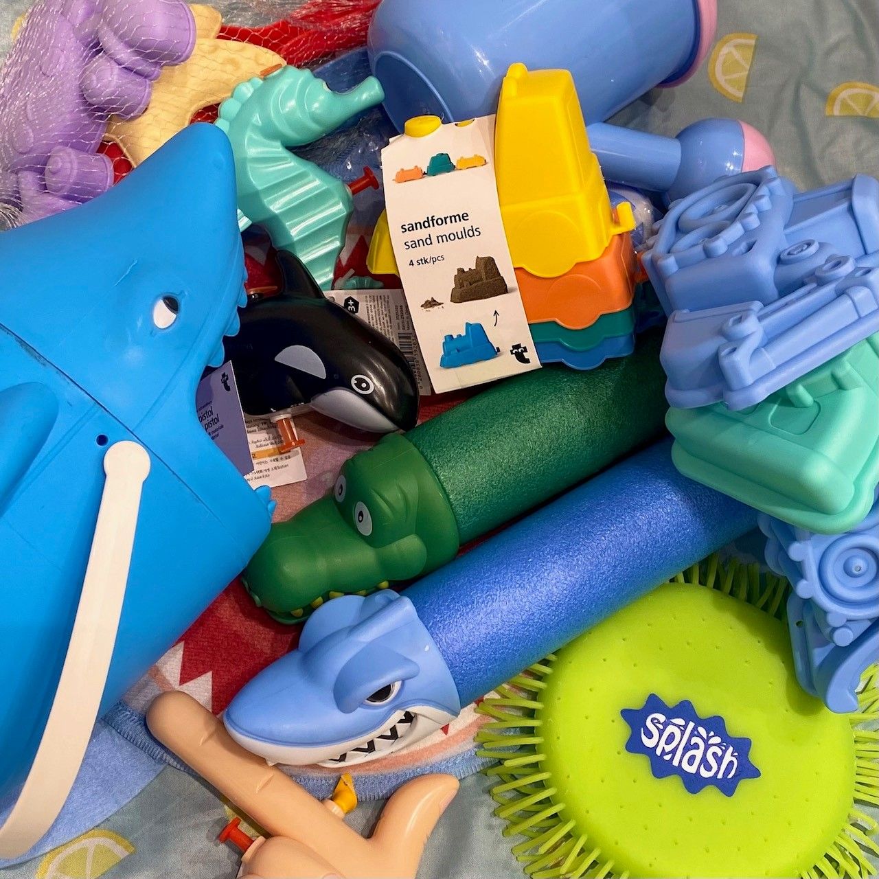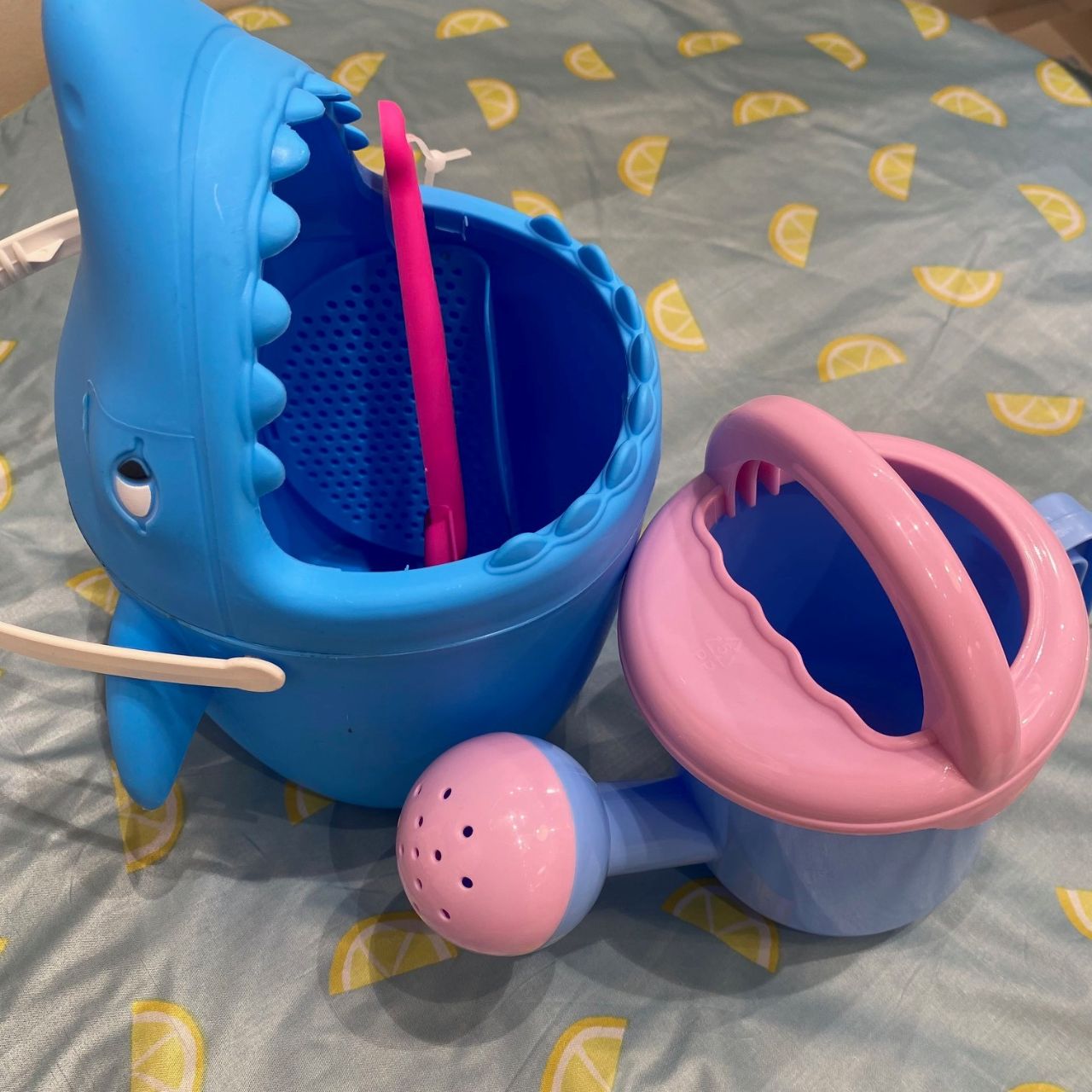 パステルなカラーが可愛いじょうろと大きなお口を開けたサメのバケツです