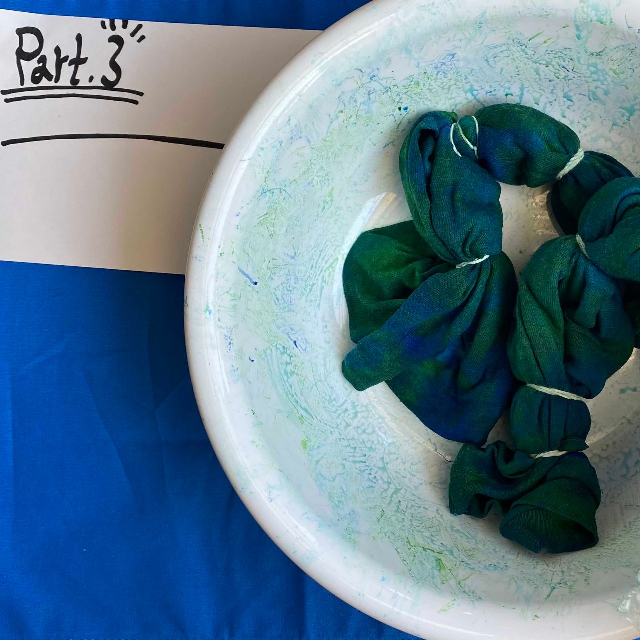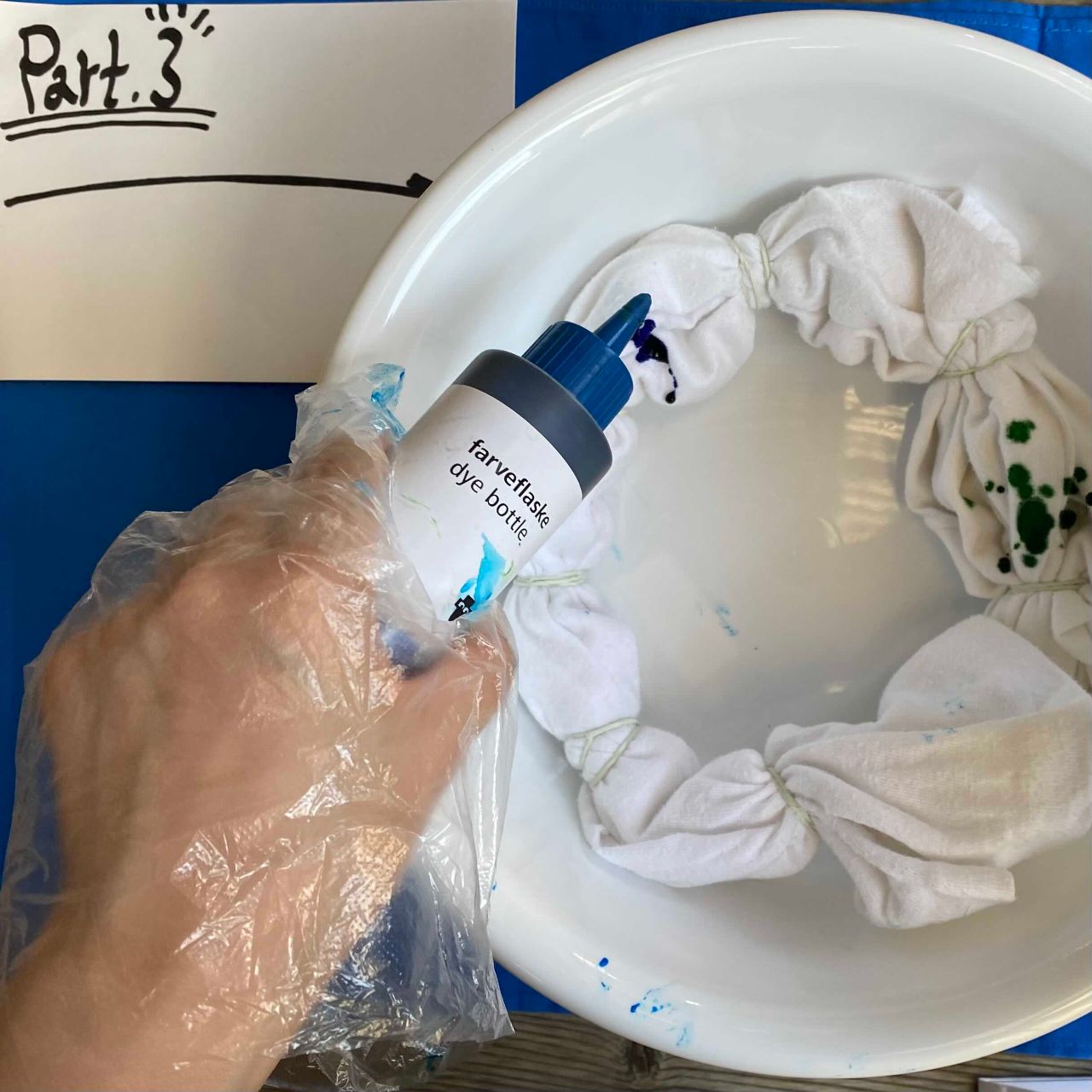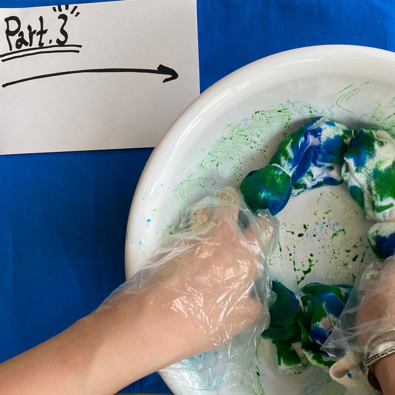 よく振ったら桶を用意して、先程輪ゴムで結んだ状態でTシャツに液を垂らします。