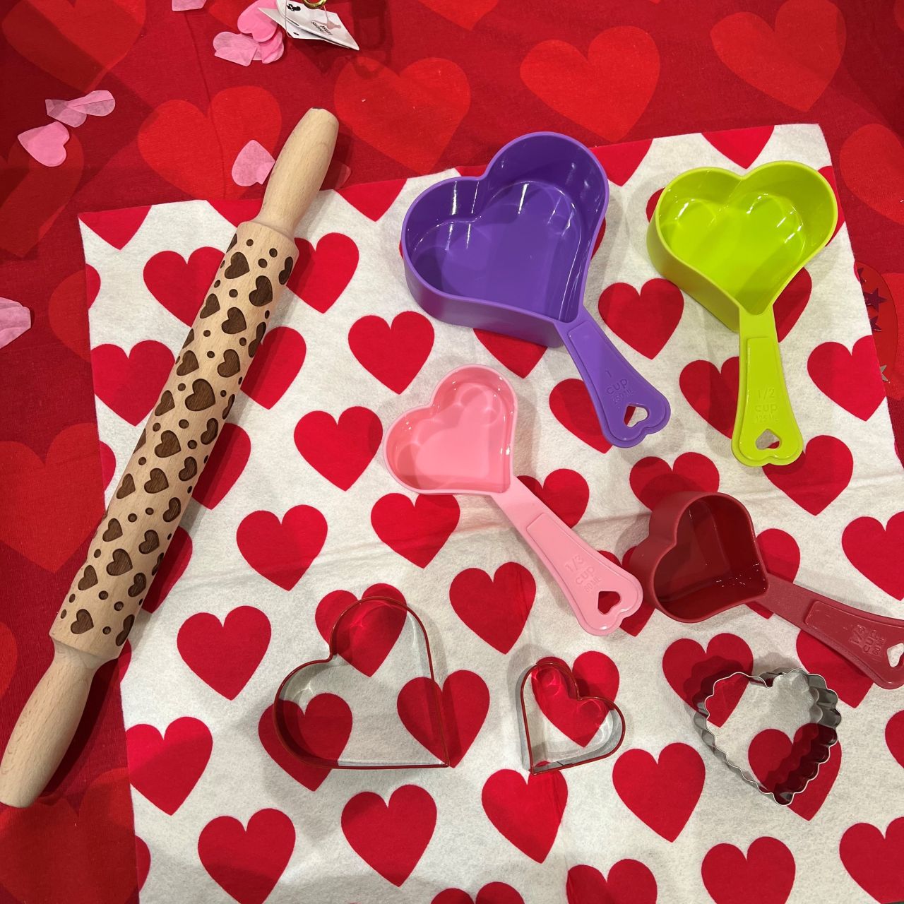 ハートのクッキーカッター、メジャースプーン、のばし棒、