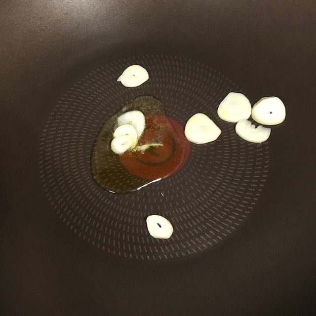 ①オリーブオイルでスライスしたにんにくをさっと炒める
