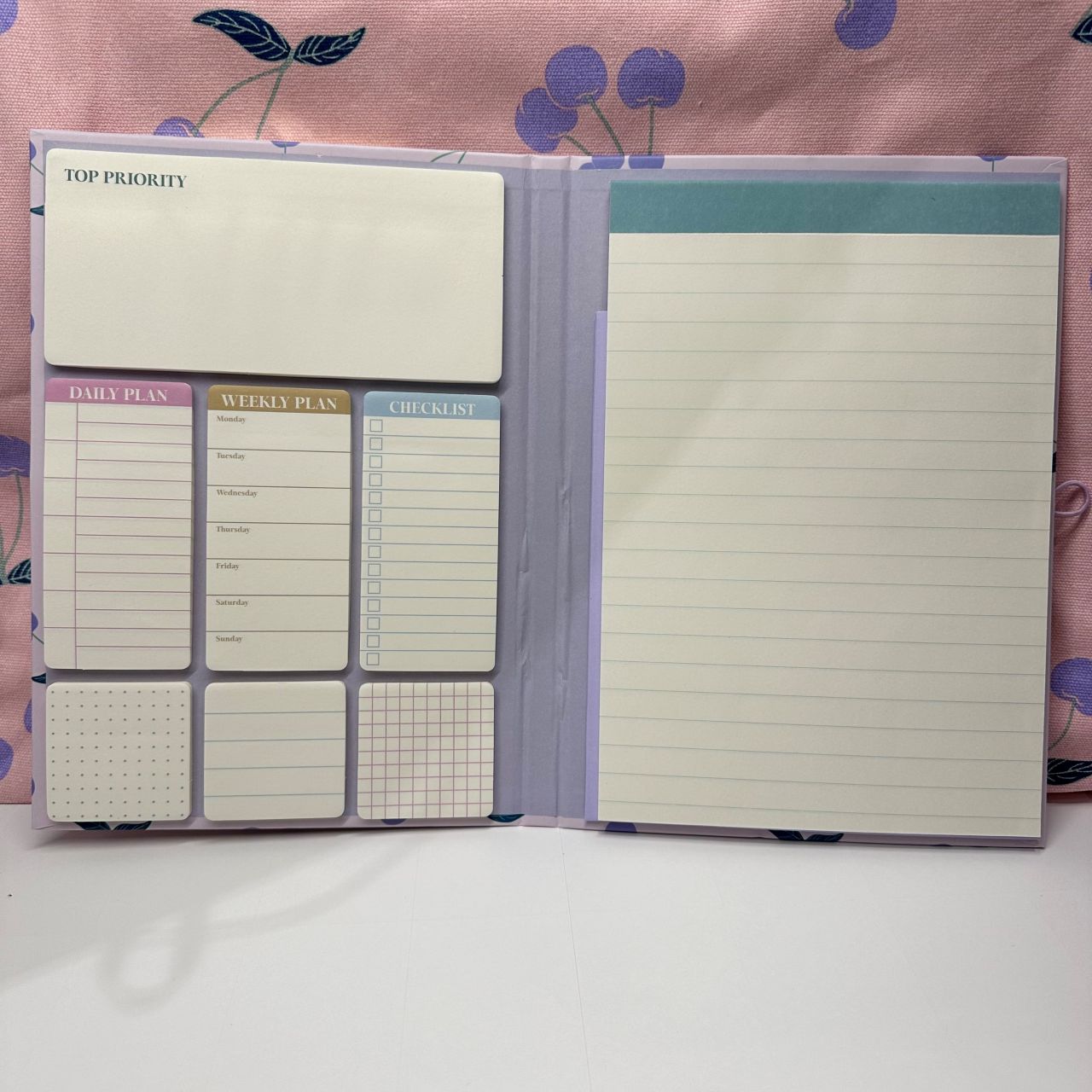 右側にはメモパッド、左側には使い勝手の良い付箋が七種類も!