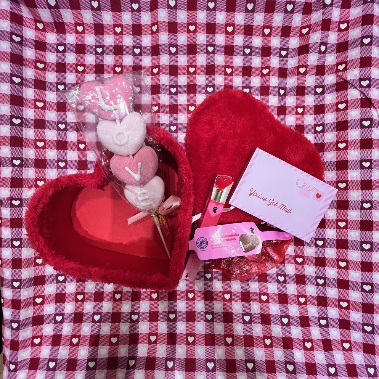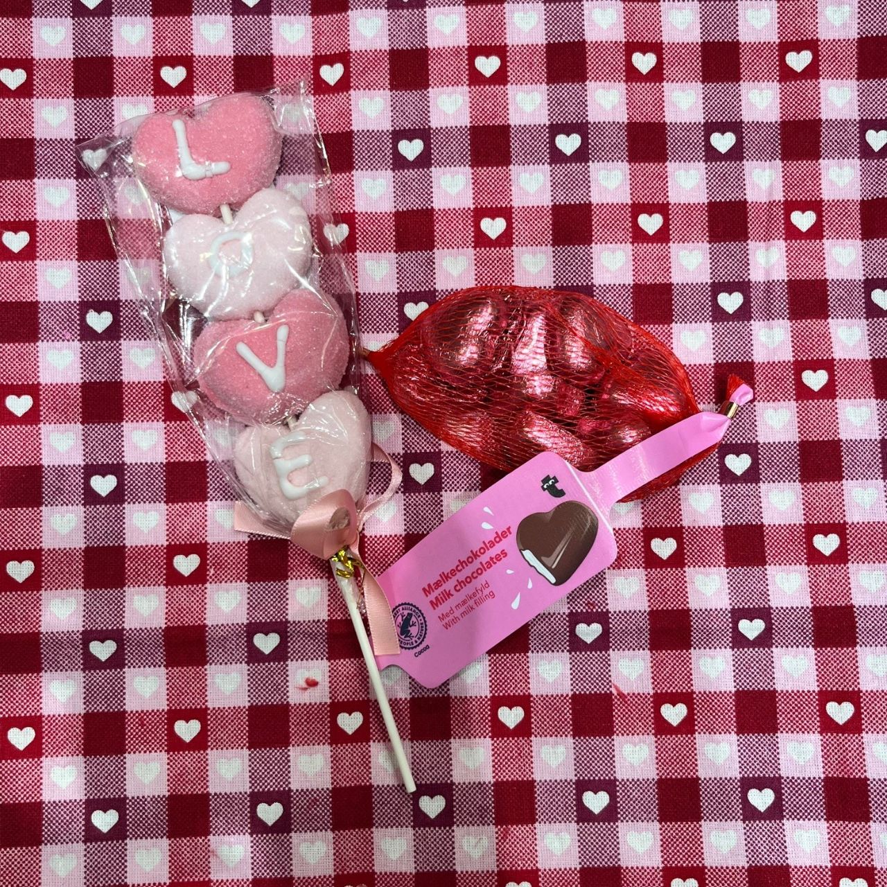 LOVEと書かれたマシュマロスティックとハートの形をしたチョコレートです♥