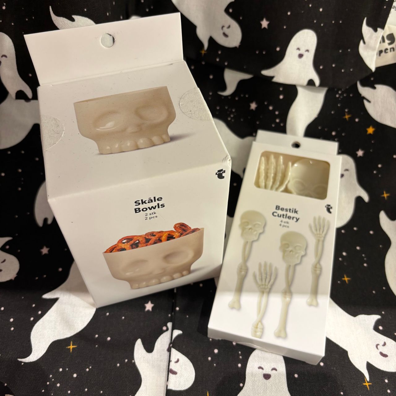 ガイコツのデザインお菓子入れとカトラリーセットです。