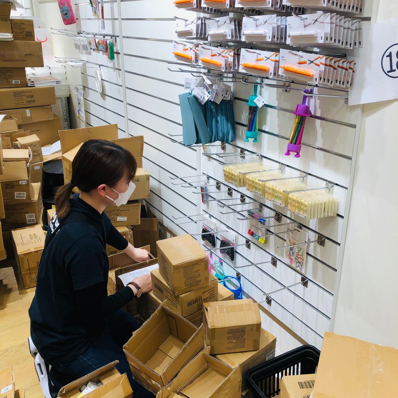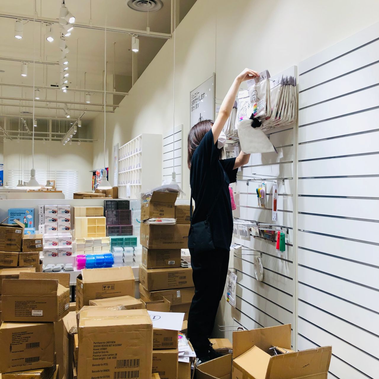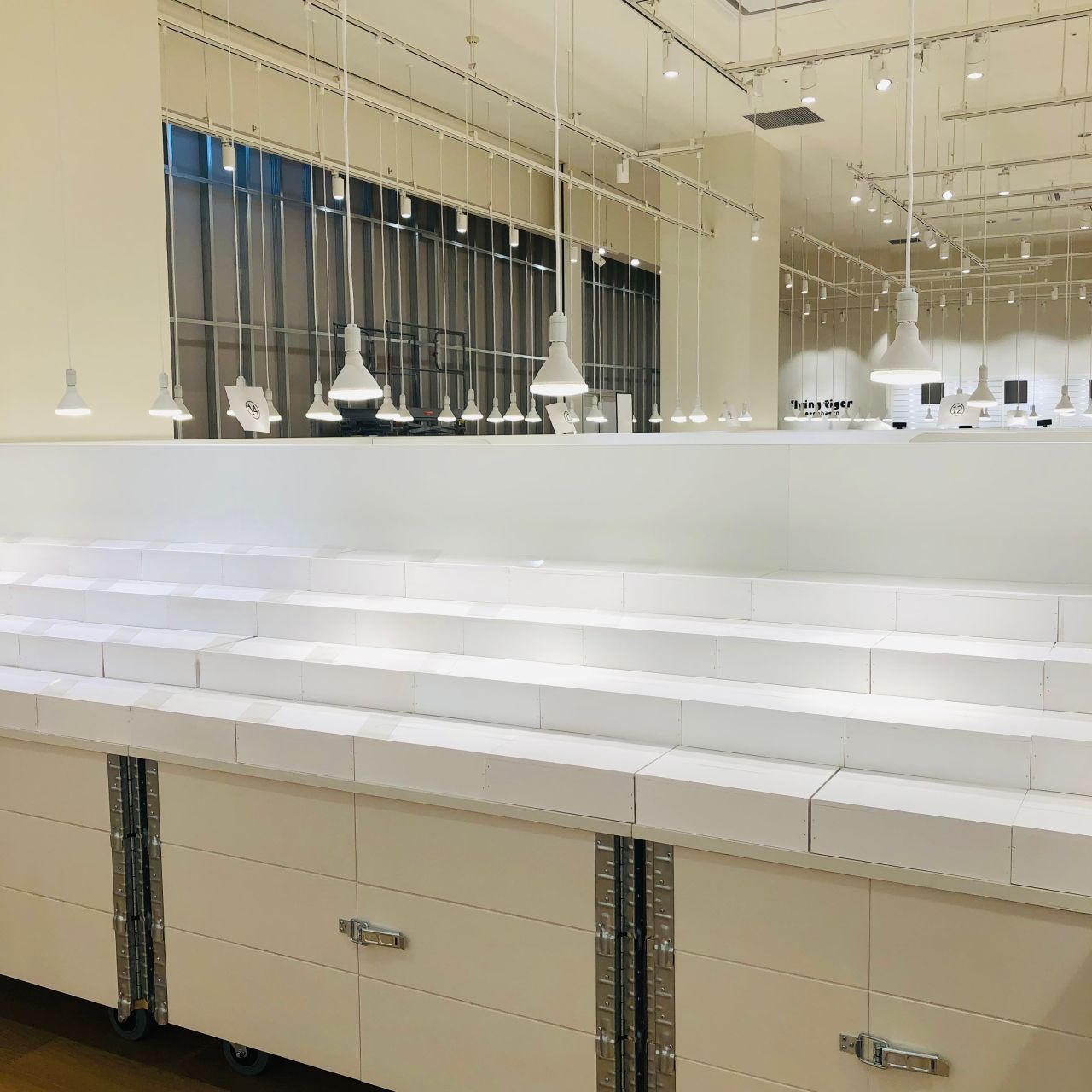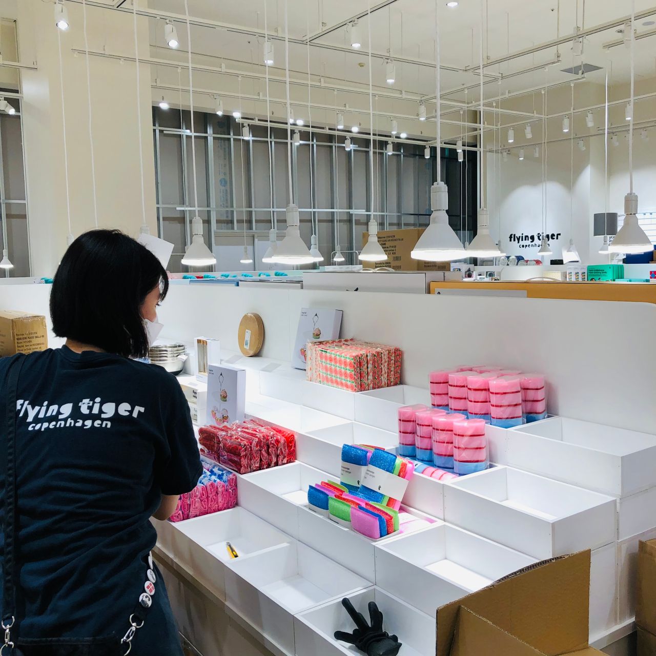 最初は何もない真っ白な店内がフライングタイガーの商品を並べることで、少しずつカラフルな店内になってきましたよ!