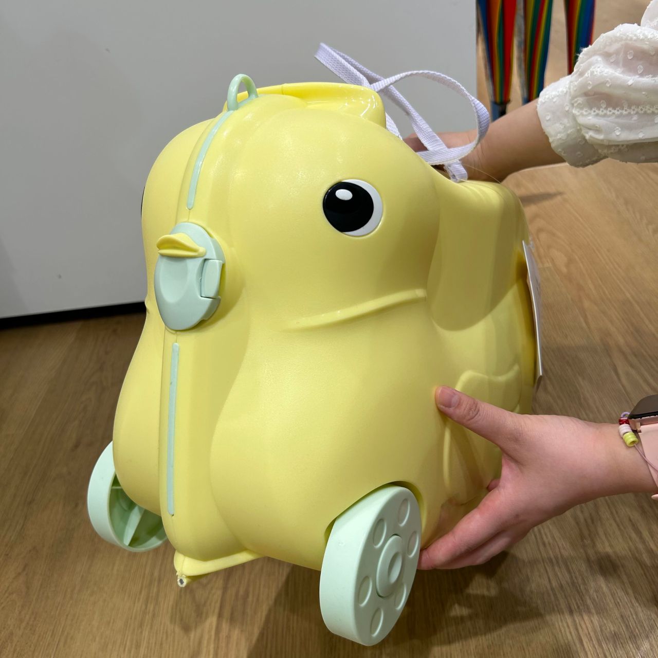 このスーツケースは、最大35kgまでのお子さんが乗れるんです!