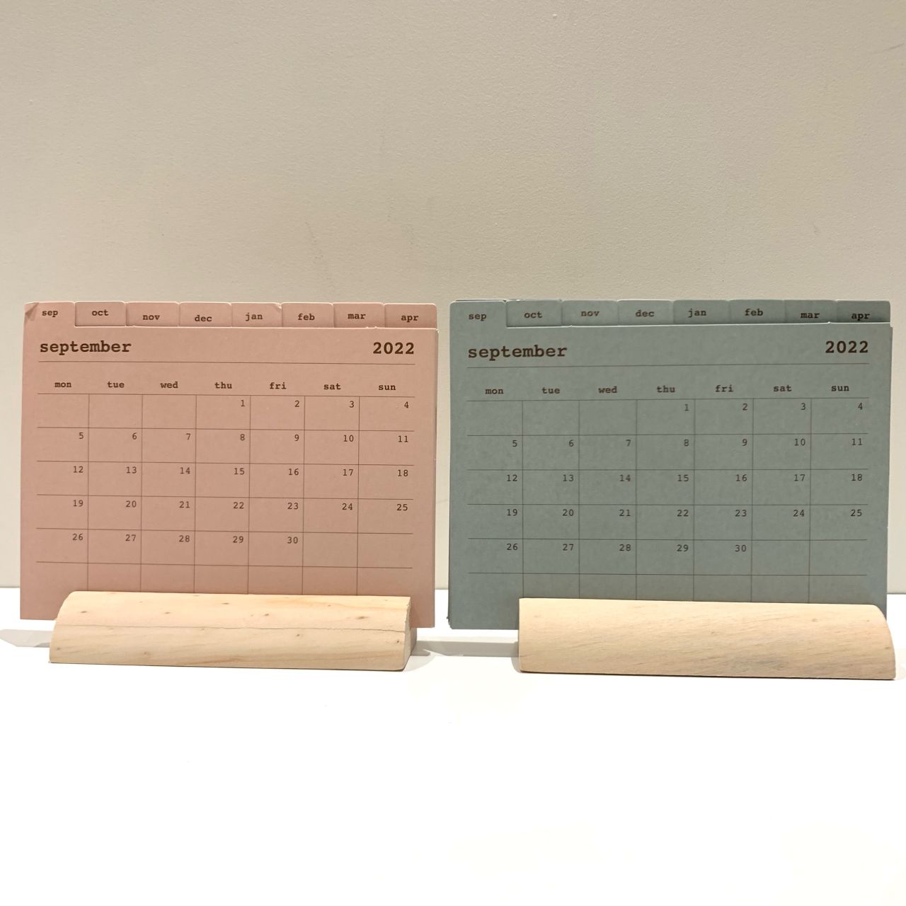 くすみカラーのカレンダーをwoodで挟んでるのが