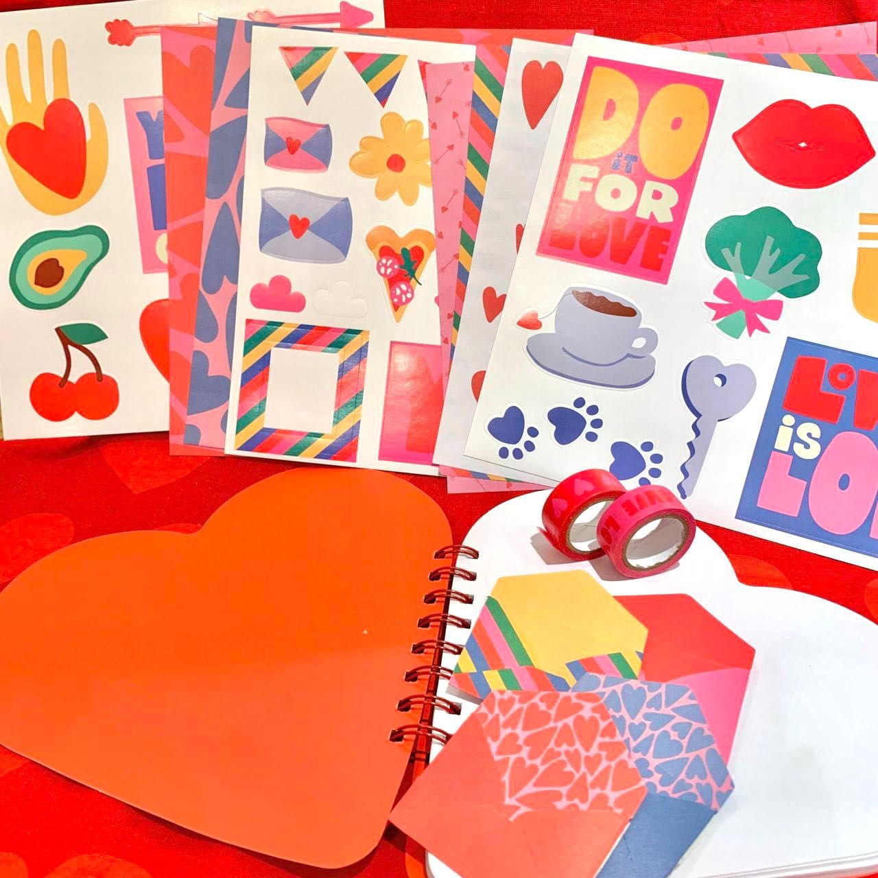 ハートのノートやステッカー、小さな便せん、マスキングテープなど