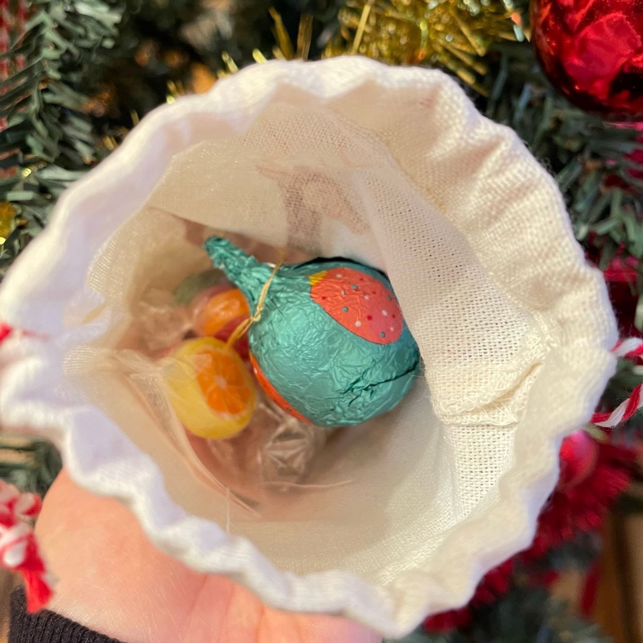 この巾着にキャンディやチョコレートを入れてツリーに飾れば可愛いオーナメントに!