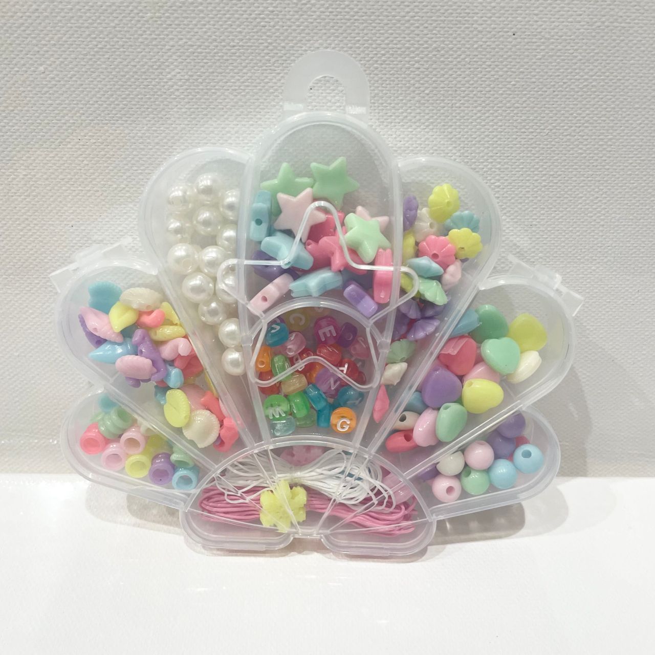 可愛い貝のケースに入ったビーズセットにはパステルなハートや星のビーズ、パールビーズなどが入っていて