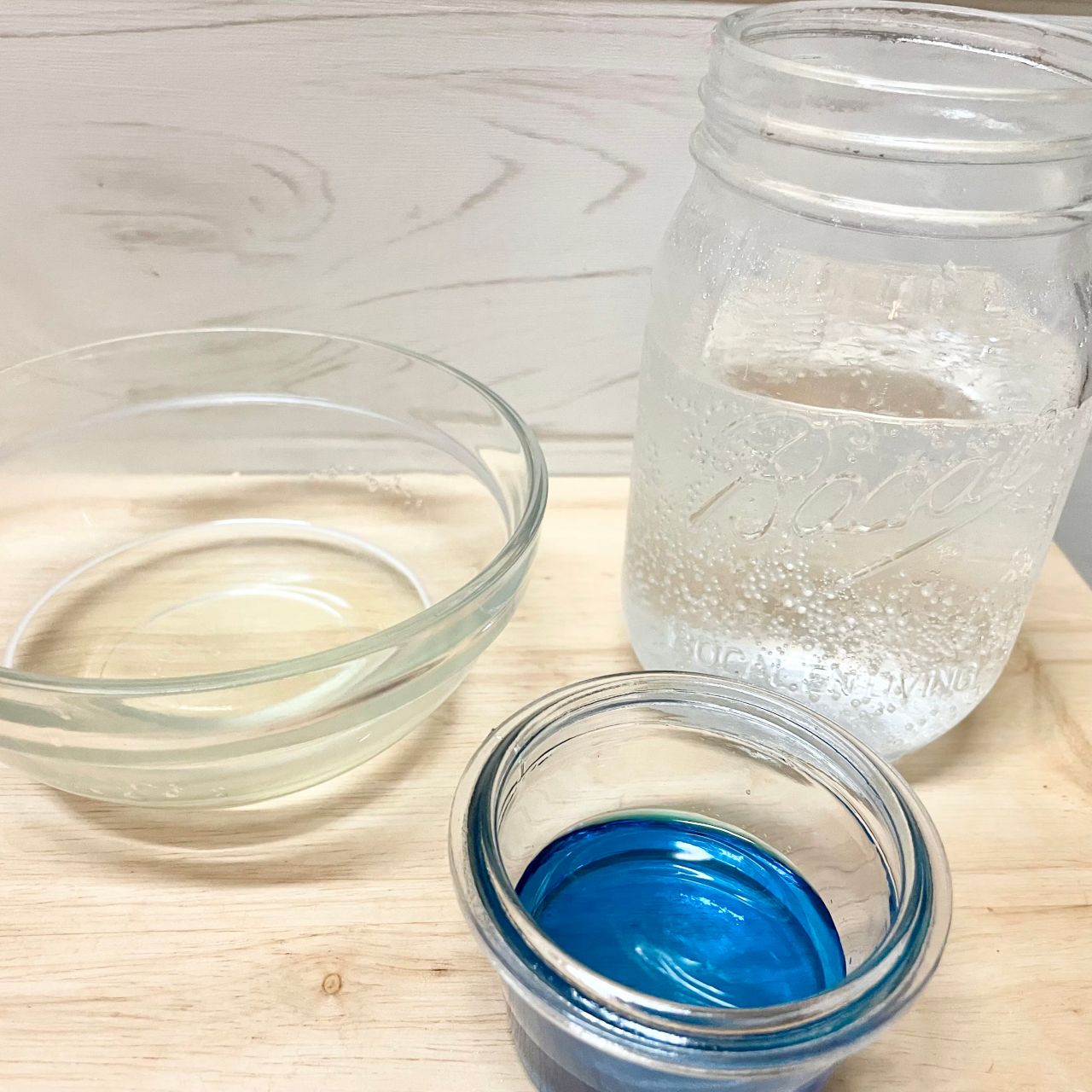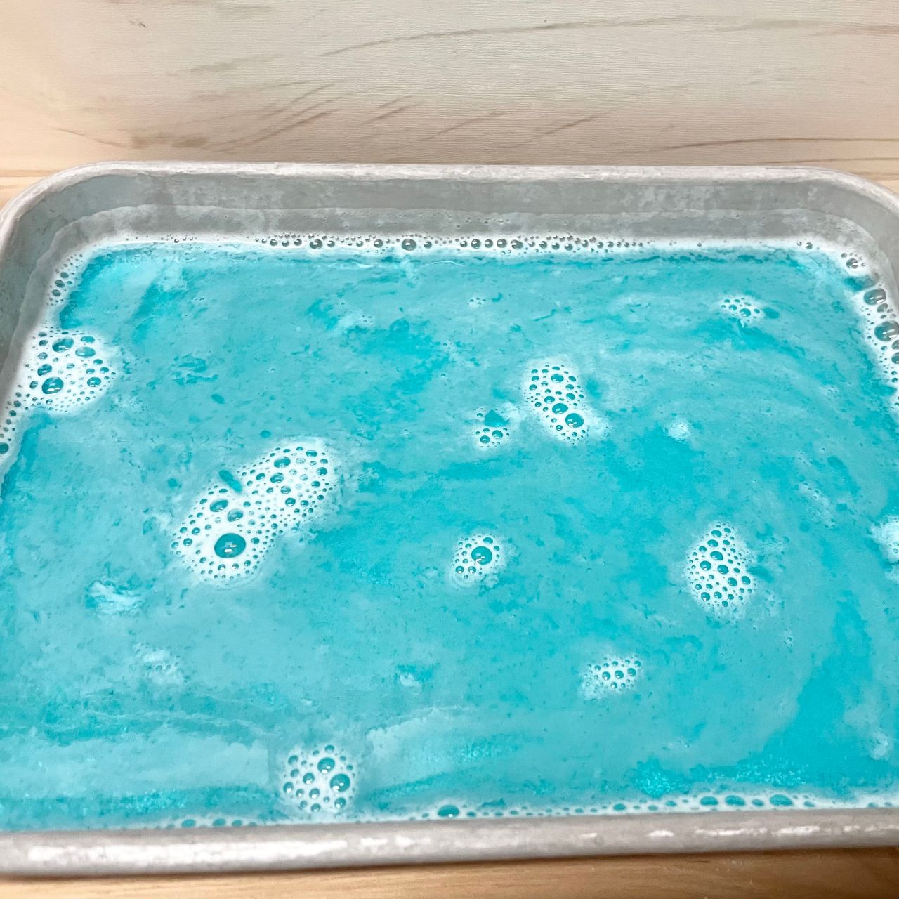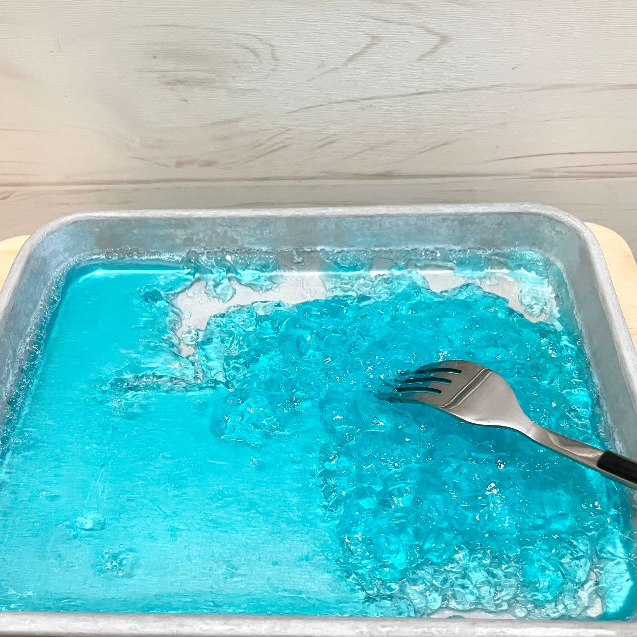 耐熱容器に水(大さじ2)を入れ、粉ゼラチン(5g)をふり入れ、ふやかす。ラップをせずに600Wのレンジで20秒加熱する。ボウルに加熱したゼラチン、ブルーハワイシロップを入れて混ぜる。