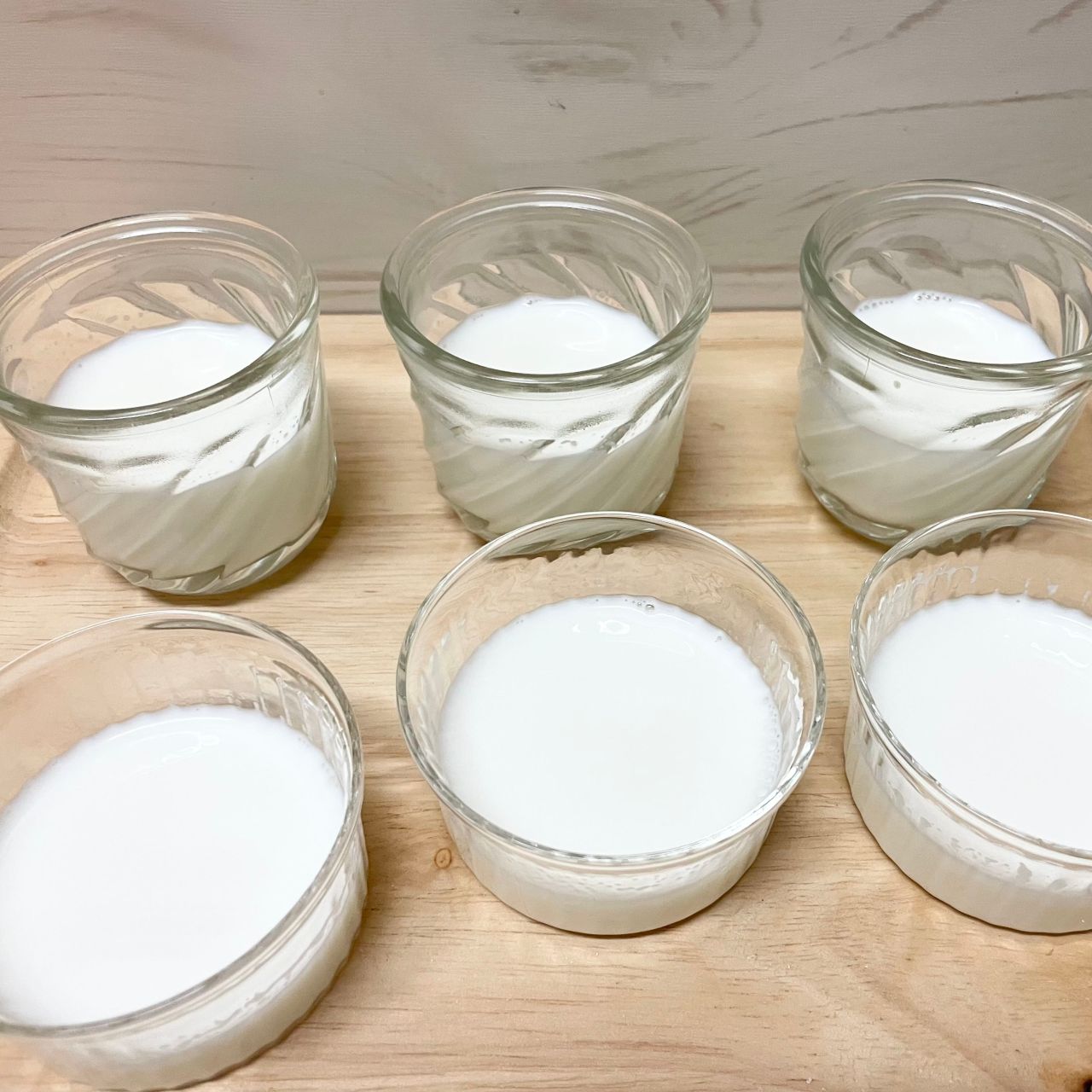 2にふやかしたゼラチンを加えて混ぜる。容器に等分に流し入れ、粗熱をとって冷蔵庫で2〜3時間以上冷やし固める(牛乳ゼリー)。