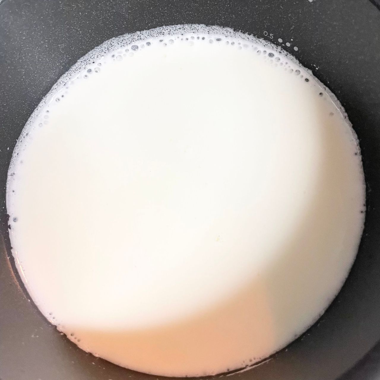 2 鍋に牛乳、砂糖を入れて弱火で熱し、小さな泡が出てくるまで加熱して火からおろす。