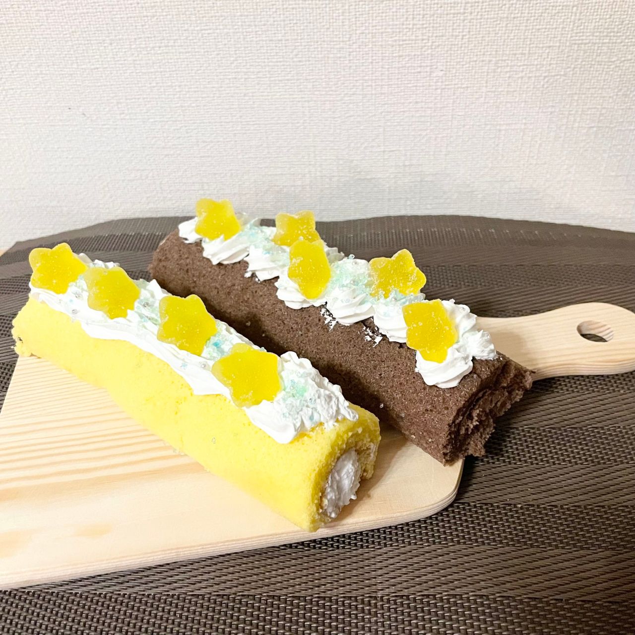 市販のロールケーキに、生クリームとフライングタイガー のCute♡& Delicious‼︎な『☆グミ』を乗せるだけ〜‼︎