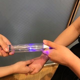 どうやら、片手から体を通して電流が流れ反対の手を通して、電気がついて音が流れるみたいです。