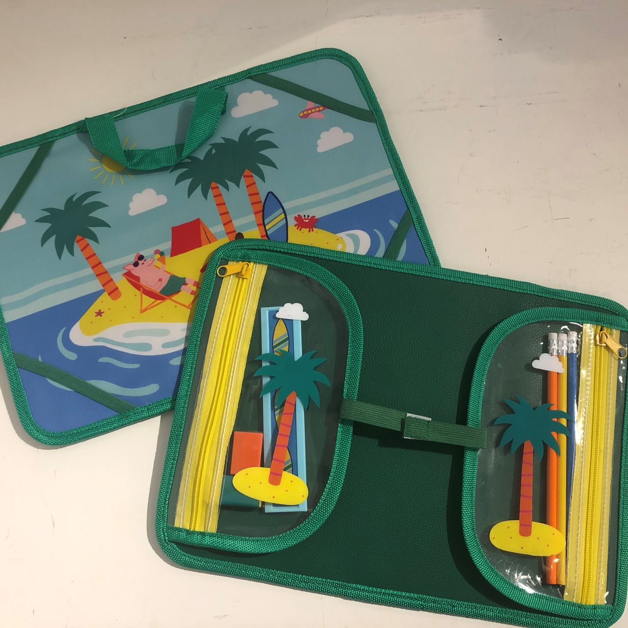 鉛筆や消しゴムが入っていて後ろには、紙を挟んで絵を描けるので、