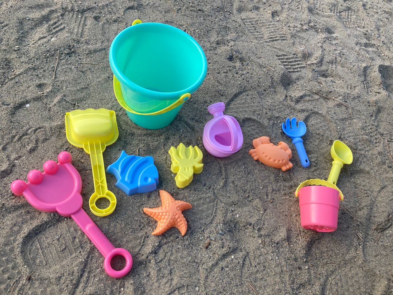 バケツとスコップ2つ、型が3つとじょうろまでセットになっています
