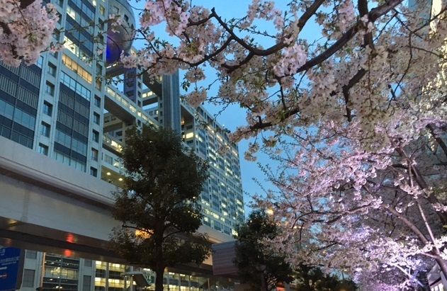 実は、アクアシティお台場の前にも、桜がきれいに咲いているんですよ~♪