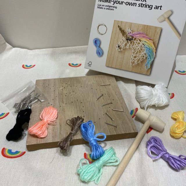 木の板に付属のくぎを打ち込み、糸を巻き付けて作るアート