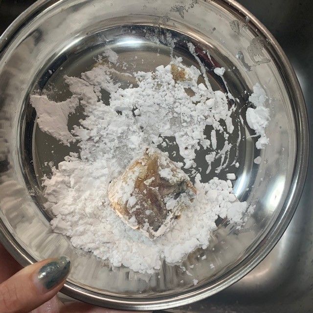 ①サバを一口サイズにカット、軽く水分を取り片栗粉をまぶす