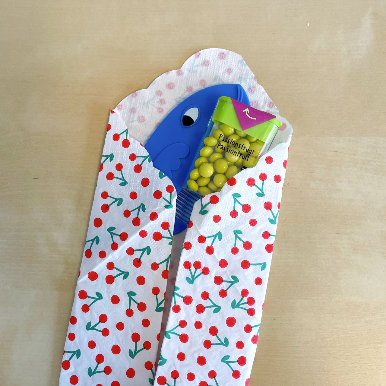 ⑤ここで形はほぼ完成!ちらっと上の部分をひらいて、小さなプレゼントをナプキンの中にいれましょう。お手紙を入れてもよし、お菓子などをいれても可愛いです^^お父さんにはお酒のおつまみも喜ばれるかも?