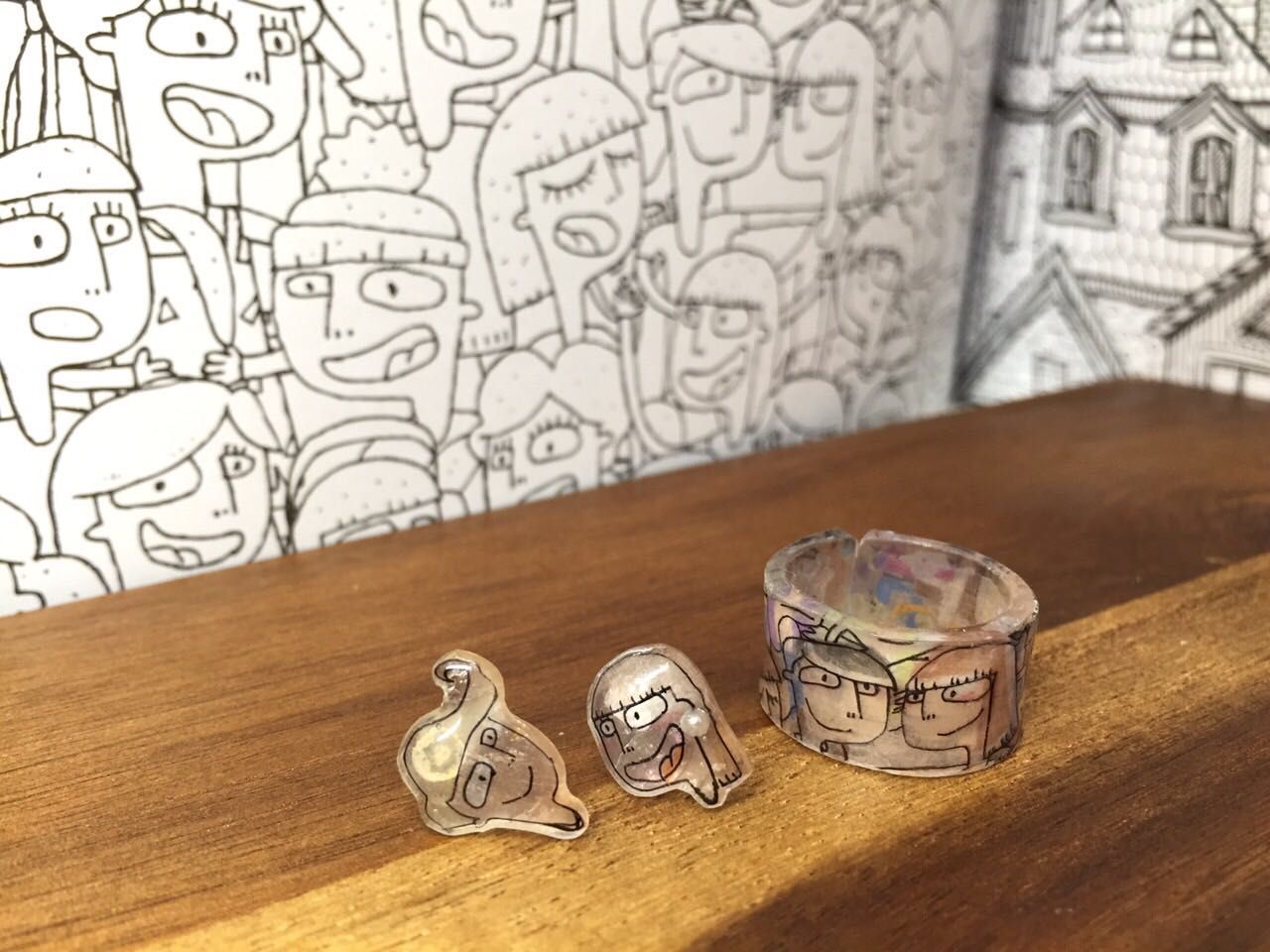 市販のプラ板を使って作ったリングと、ピアス。
