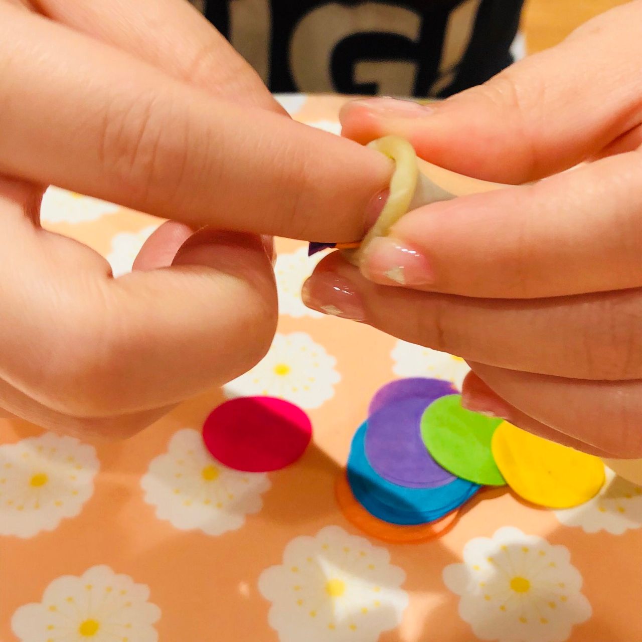 ②コンフェッティを重ねて半分に優しく折りたたみます。