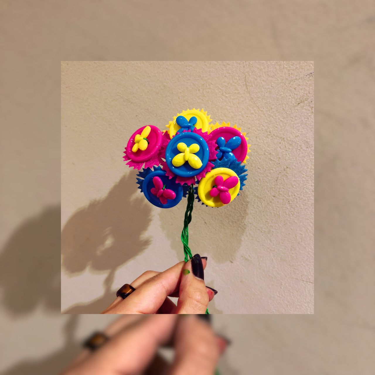 中に入っている、緑が針金になっていて、それに、蝶々を通して、ボタンの穴に通してお花を最後に通すとDIYブーケの出来上がりっ!