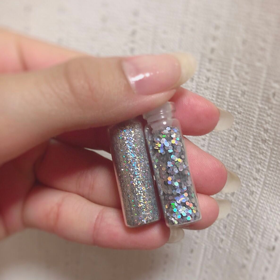 デコりたい部分にトップコートを塗り、乾く前にラメホロをかけ、かけすぎたりしたら、ビニールの上で逆さまにして余分なラメホロをとる!