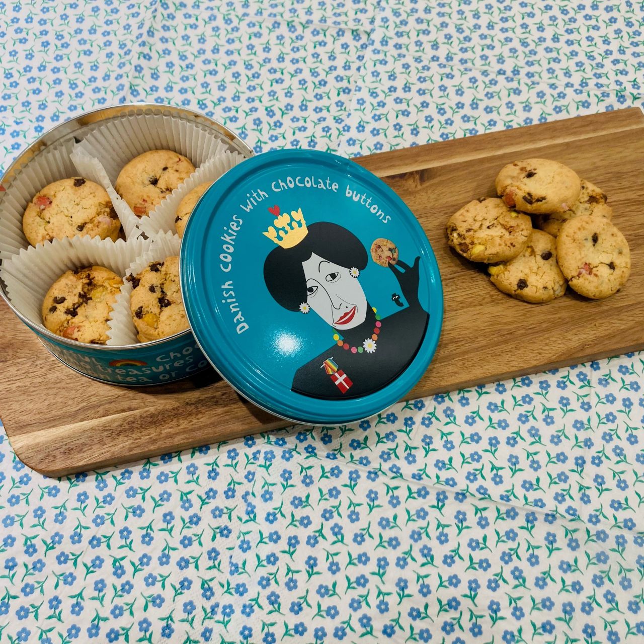 カラフルなボタンチョコレートが散りばめられているバタークッキーは