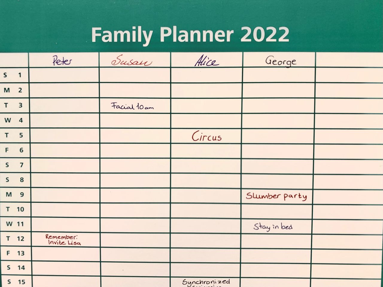 ファミリーカレンダーは最上段列に名前を入れるための空欄があり、