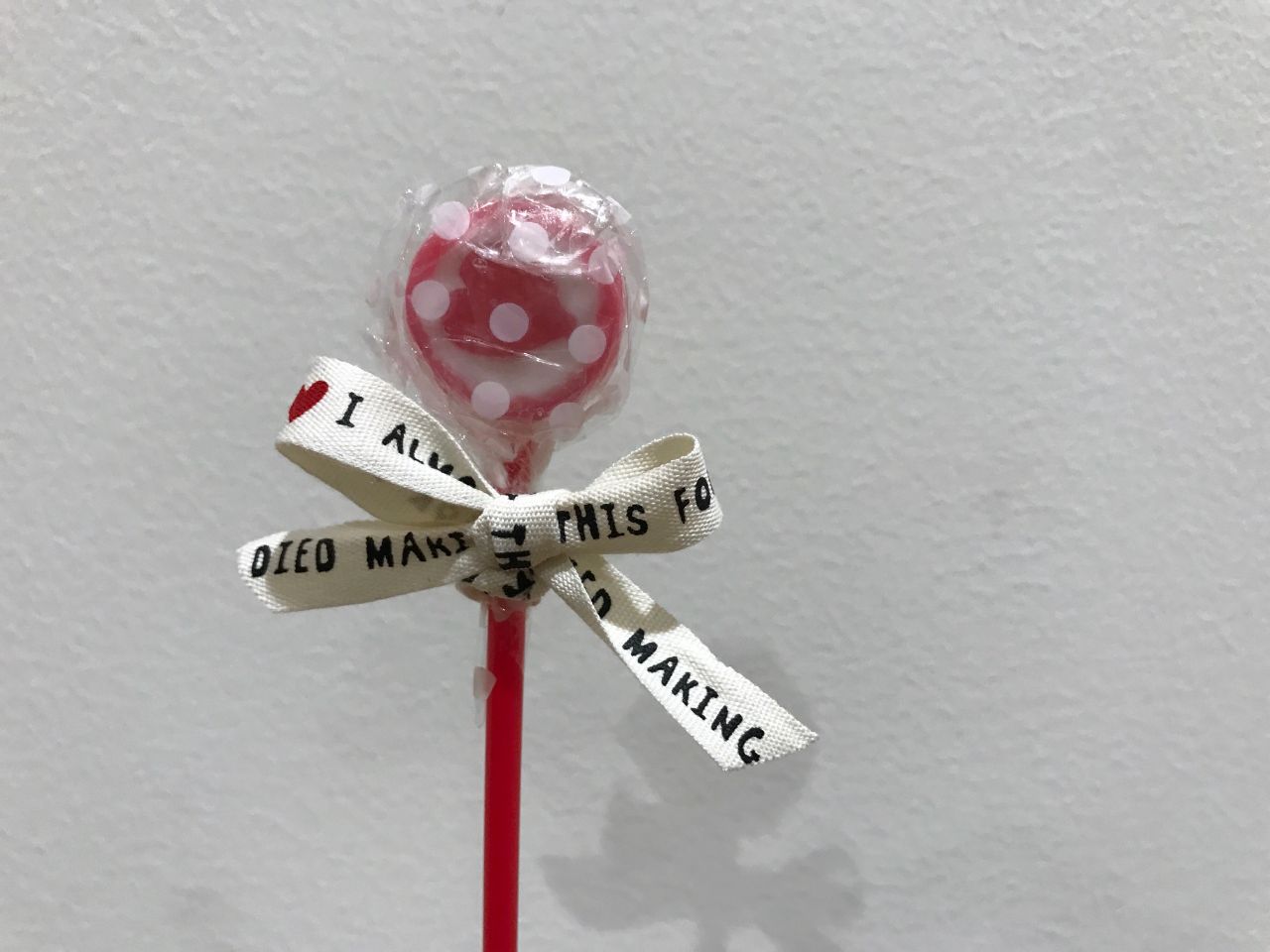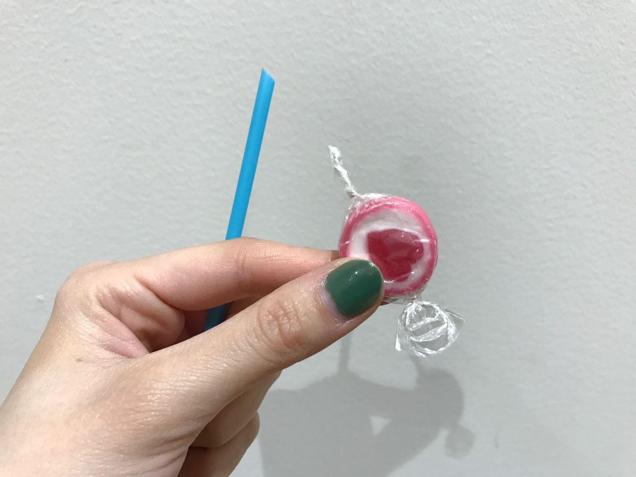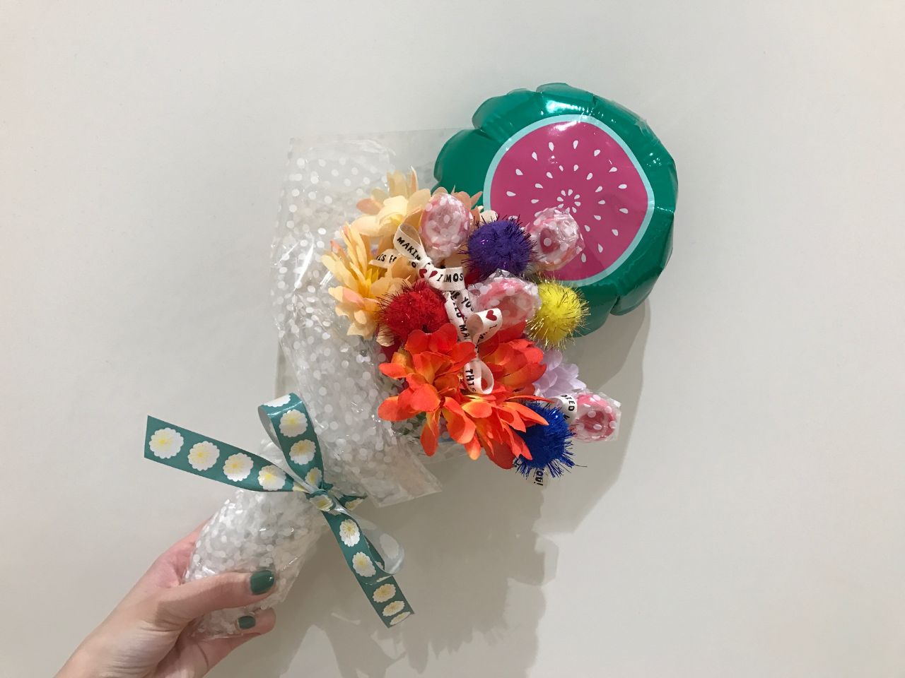 そして、お花のペンとキャンディとポンポンをテープでまとめて
