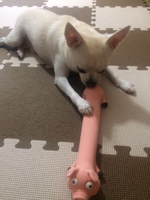 ブタさんのしっぽが気になるようで、ずっとしっぽをハムハムしていました(笑)