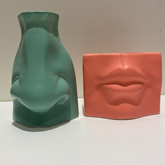 お鼻のデザインのフラワーベースとお口のデザインのフラワーベースを