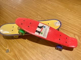 スケボーだって売っています!立てかけている方のスケートボードは乗るとタイヤが光ります☆