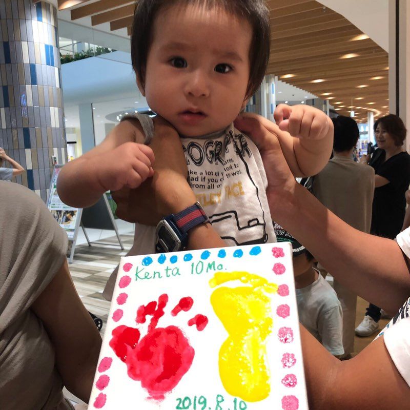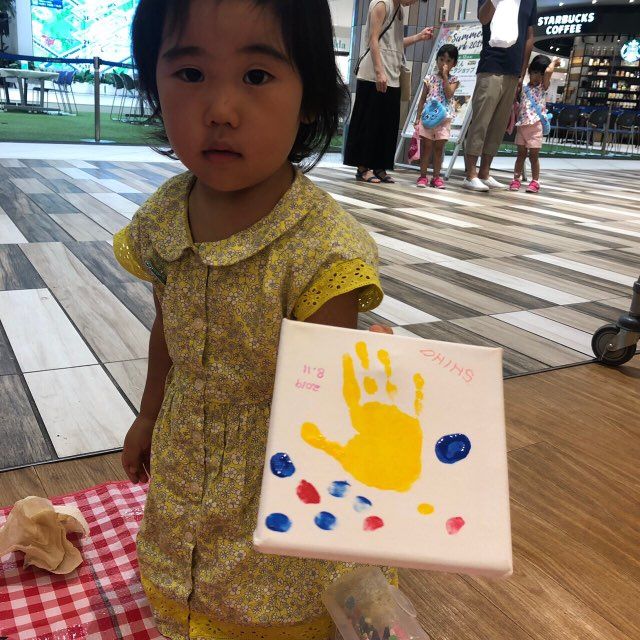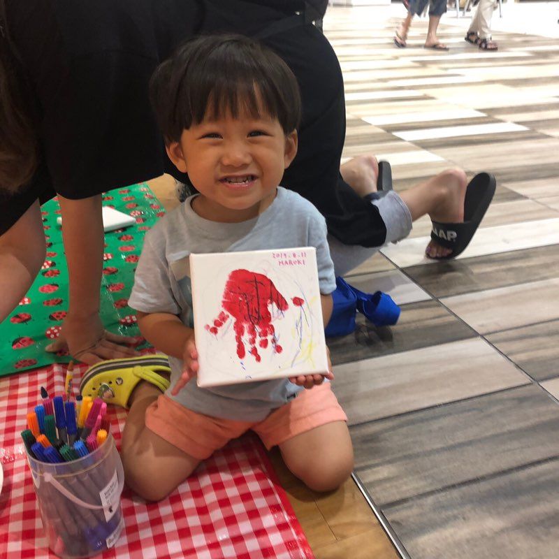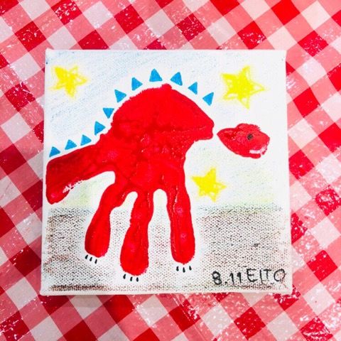お子さんの手に絵の具を塗ってキャンパスにペッタン!として頂き、