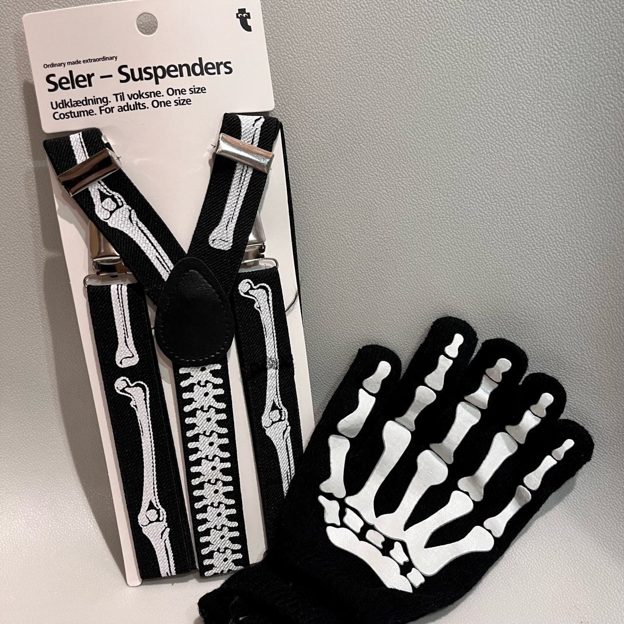 まずは骨のデザインが描かれたグローブとサスペンダー
