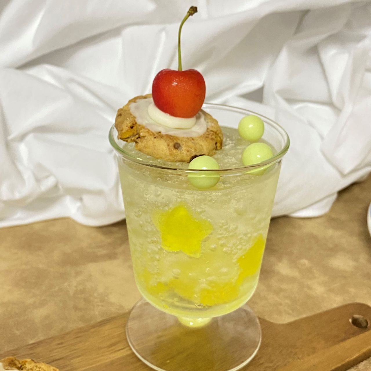 アイシング風クッキーと、レモングミを炭酸に入れて作ったしゅわしゅわゼリーです!