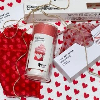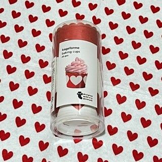 赤と白の2色が入ったベーキングカップは、ハートのイラストがついていて