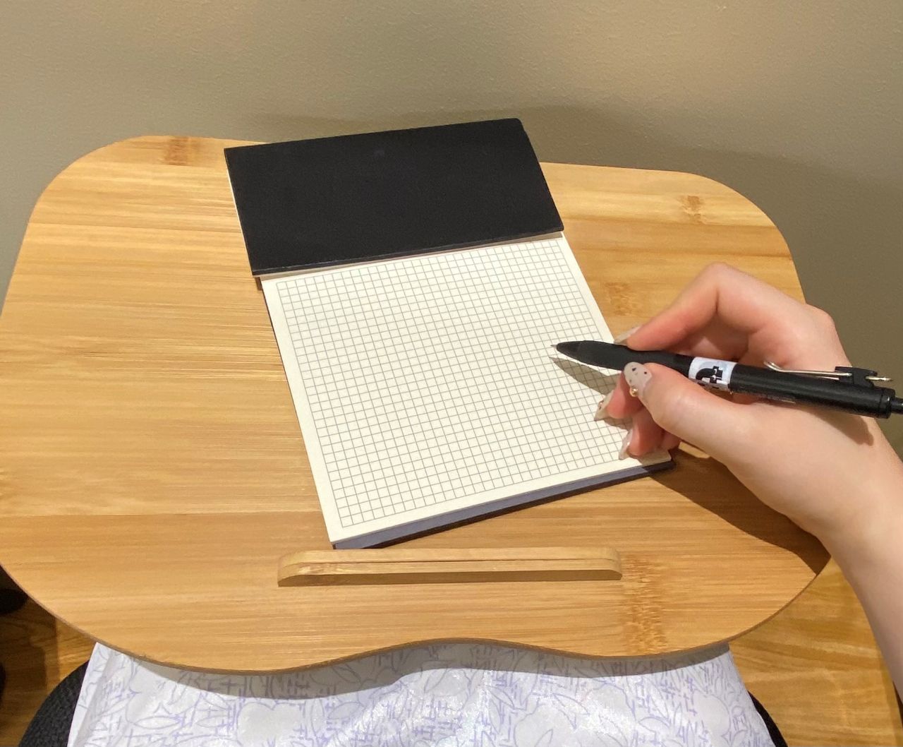 画像のように膝の上にのせて使うのですが、片面が机のような木材で