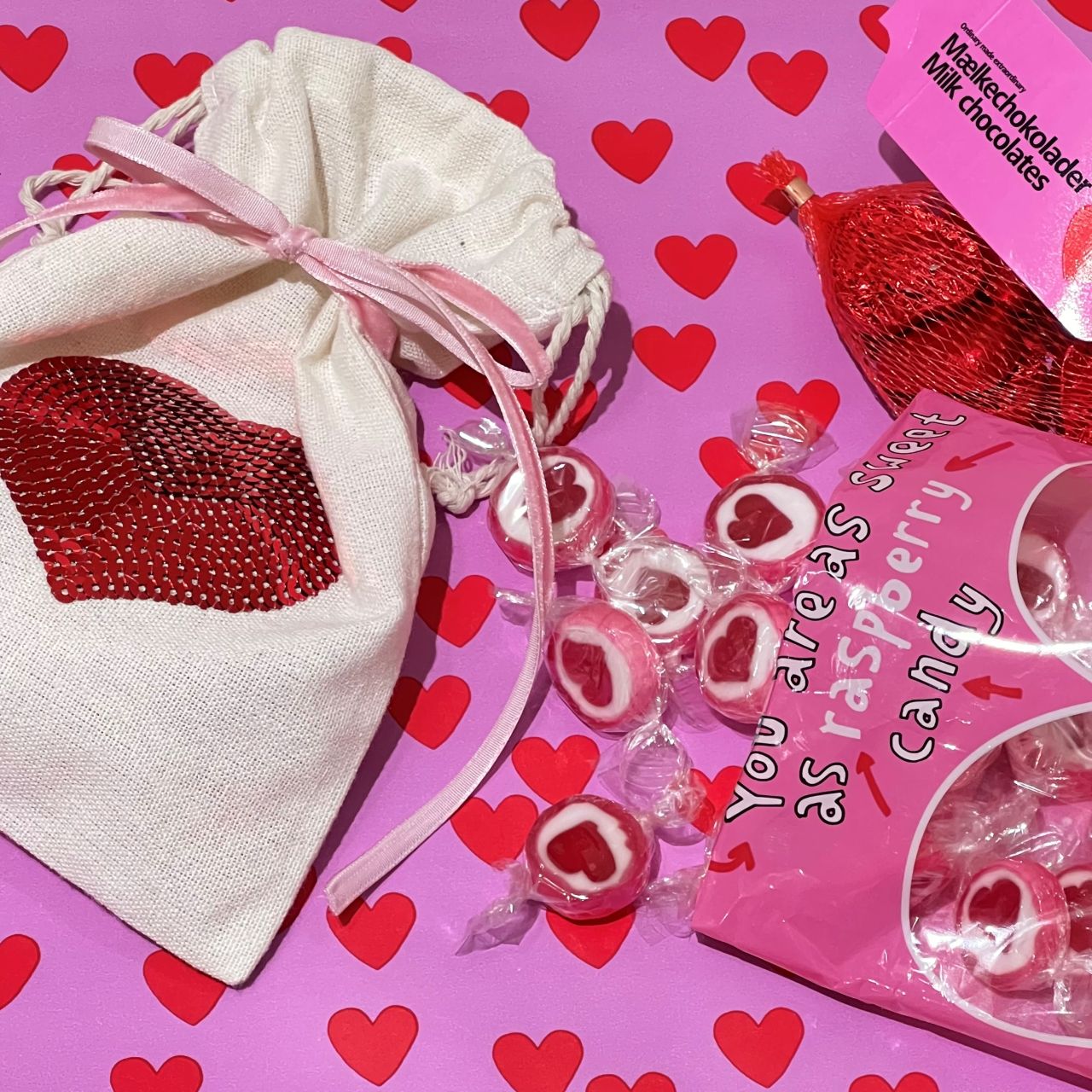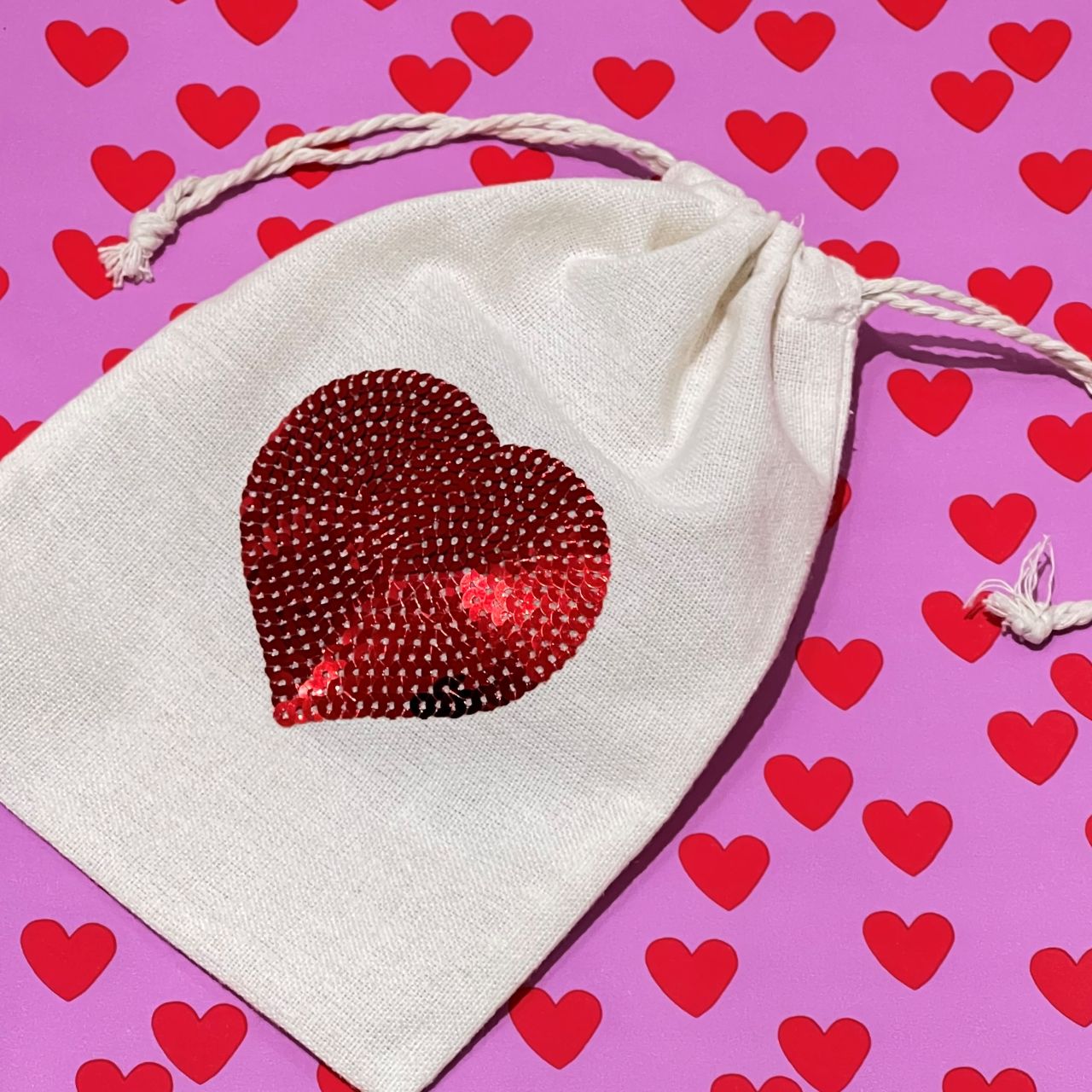 スパンコールで出来た真っ赤なハートが目を引く可愛いギフトバッグは、巾着になっているので